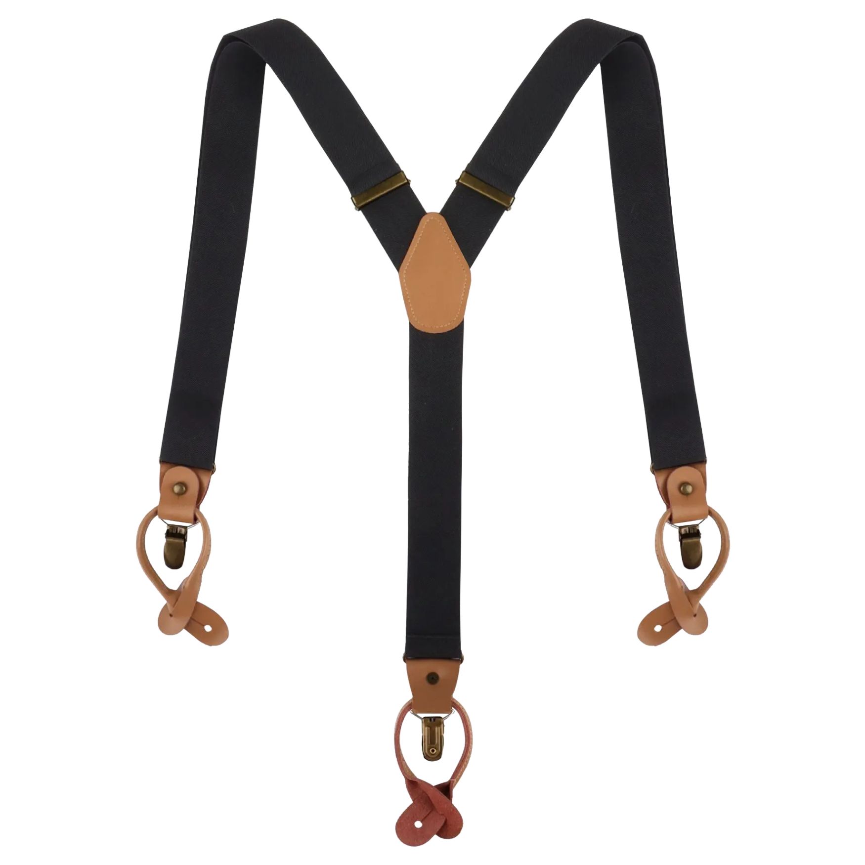 De suspenders urban-classic zijn moderne bretels met een strak ontwerp, voorzien van elastische banden en bevestiging via leren gespen of clips van oud messing. Ze hebben een Y-vorm met twee banden aan de voorkant en één aan de achterkant. De lengte is verstelbaar dankzij de klemmen.