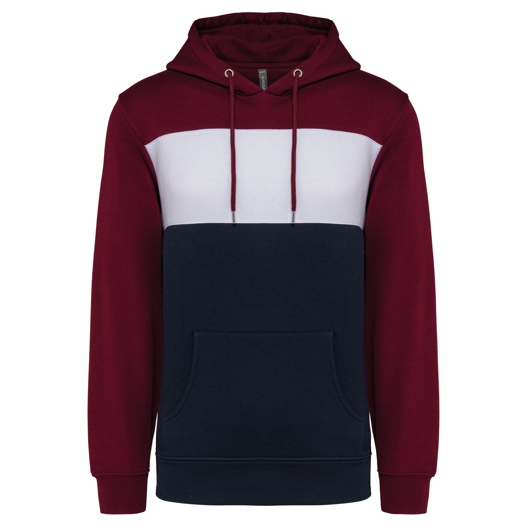 Driekleurige kapmuts trui uniseks. Gestroomlijnde pasvorm. Gekamd katoen. Gekrild vloeren 3 draden. LSF (Low shrinkage fleece). Enzymatische was. Driekleurige kapmuts trui met een centrale witte band op alle kleuren. Afwerking randen 1x1 onderarm en onderkant van het kledingstuk in buisvorm voor een betere afwerking, met naad. Kangoeroepocket met dubbele naad. Kap met plooien met oogje en metalen koorduiteinden, met ronde koorden. Randeigenschap met chevrons in dezelfde kleur. Elasthaan aanwezig op de onderkant van de mouwen en het kledingstuk om te voorkomen dat het kledingstuk vervormt. Halfmaan op de rug voor gemakkelijke personalisatie. Merketiket aan de kraag en een losmaakbare maatpuck om de personalisatie te vergemakkelijken. Samenstelling: 80% Katoen, 20% Polyester.