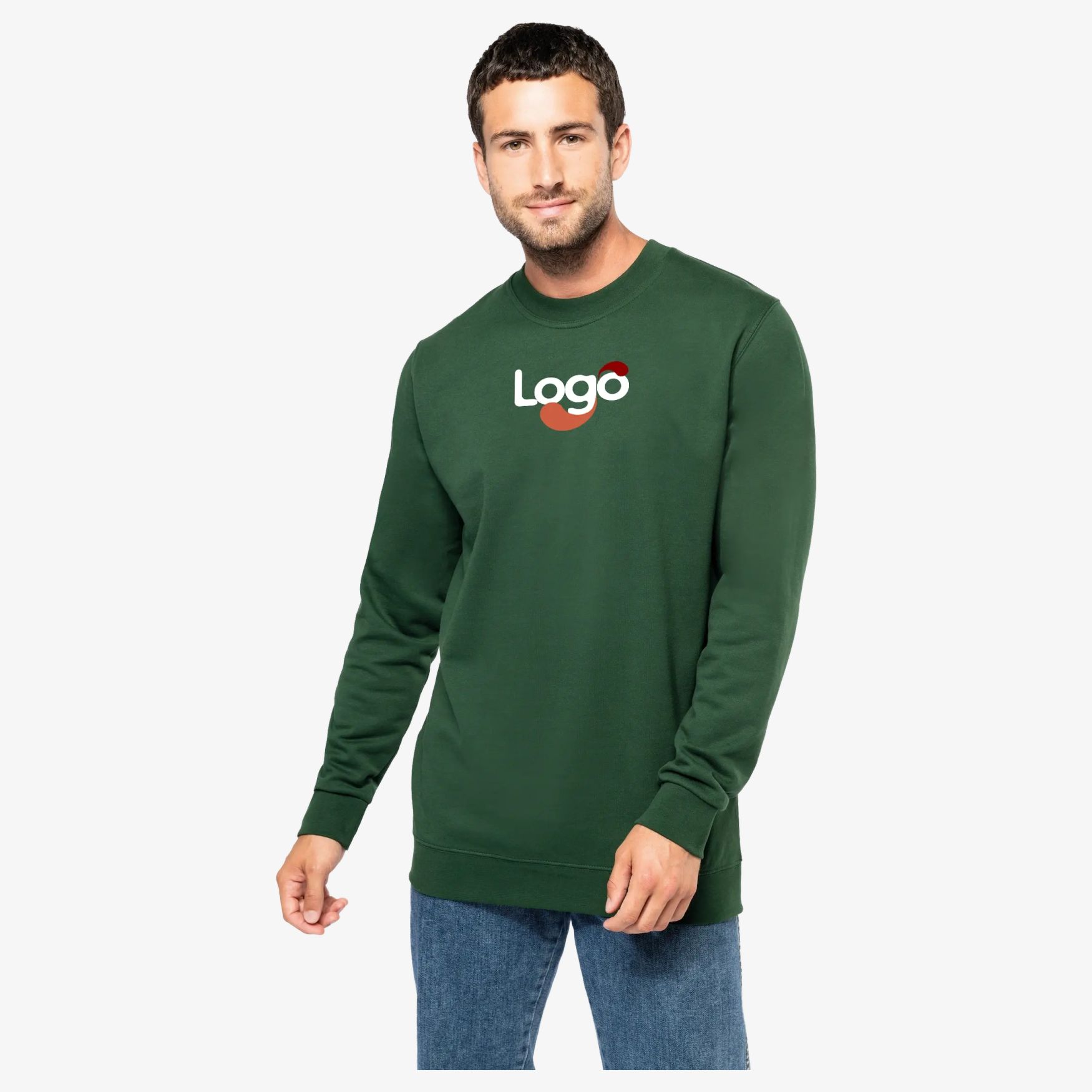 Het unisex sweatshirt met ronde hals is gemaakt van geborsteld molton met een rechte pasvorm en een doorgestikte afwerking. Het bevat geribde boord 2x1 met tubulaire montage aan kraag, mouwuiteinden en onderzijde. Een ton-sur-ton jersey binnenband is aan de binnenkant van de hals geplaatst. De maatchip vervangt het label om personalisatie te vergemakkelijken. De samenstelling is 50% ringgesponnen katoen en 50% gerecycleerd polyester na consumentengebruik.