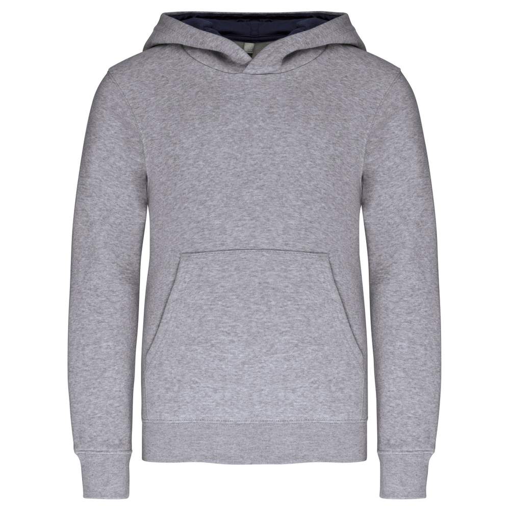 Kindercontrast capuchon sweat-shirt van katoen polyester. De sweater is uitgerust met een kangoeroepocket, een discrete opening en een bevestiging binnenin de kraag voor het passeren van oordopjes. Afgewerkt met bord-côt aan de polsen en onderkant, evenals een geflitste en contrast capuche.