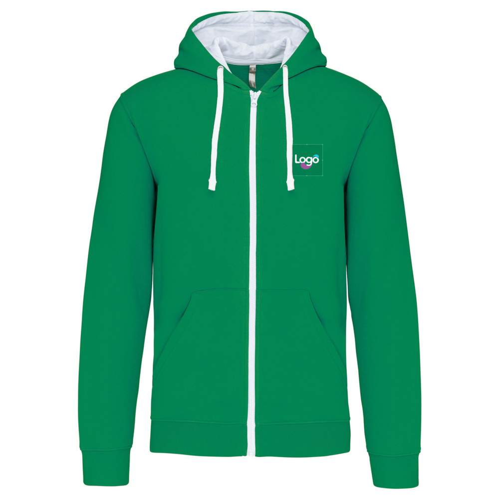 Ritssweatshirt met contrastcapuchon. 80% gekamd katoen / 20% polyester. Geharst vilt. Luisterdraad pas in de beverpocket en halsband. Bord-côte aan de onderkant van mouwen en klederdracht. Capuchon geflankeerd en met contrast door middel van trekkoord. Contrast YKK® rits. Mogelijkheid tot personalisatie door borduren voor een uniek merk.