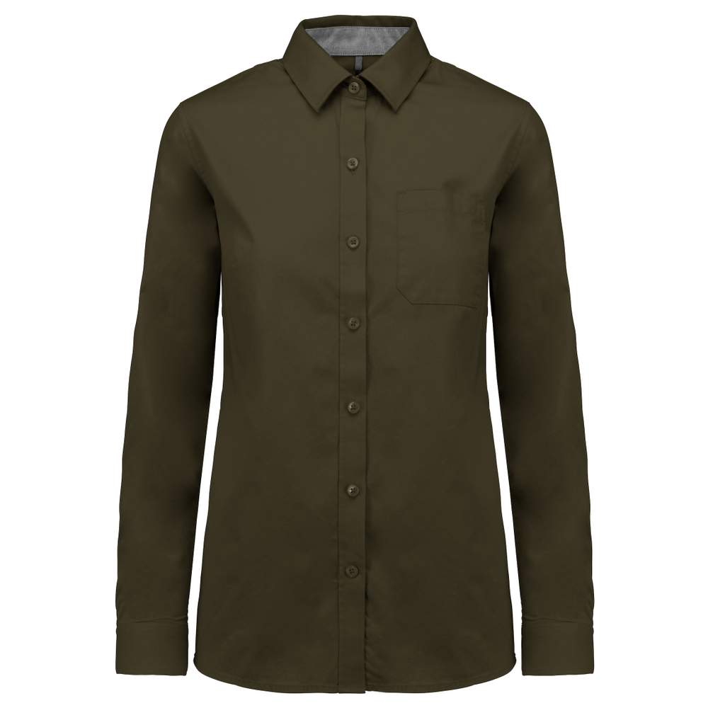 Dit vrouwelijke hemd is gemaakt van 100% katoen sergé, wat een zachte en comfortabele aanvoeling biedt. Het heeft een klassieke passeforme met lange mouwen en een borstzak. De details omvatten een binnenste voet van de kraag en contrastrijke polsen in Oxford zilver kleur, evenals een rug met een comfortplooi en een gestoffeerd inzetstuk. De zorgvuldig afgeworpen randen omvatten omgeslagen naden en een instelbare pols met een kapjesmanchet die is geboutonneerd. Een herinneringsknop voltooit dit ontwerp.