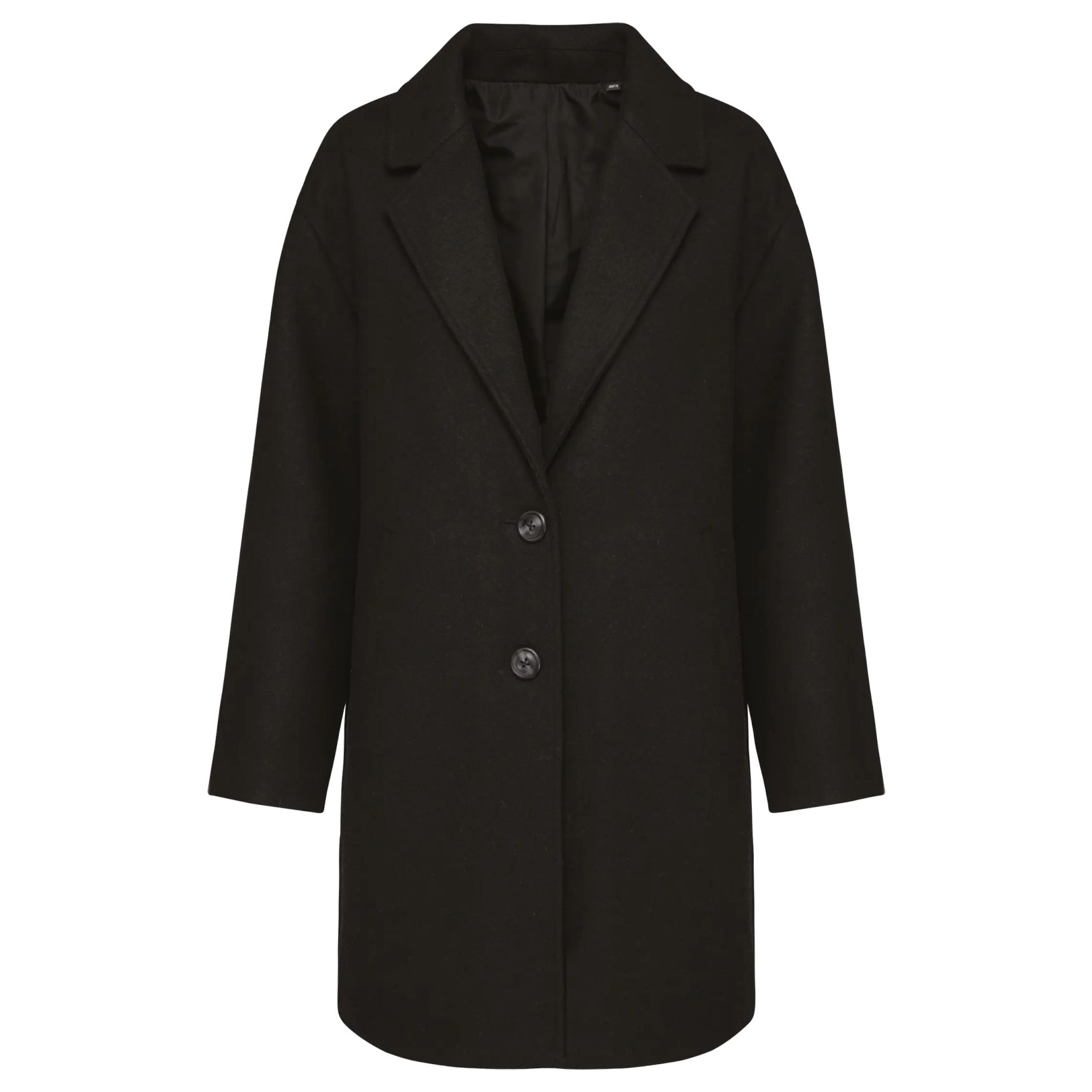 De Manteau Femme in wollen lakenweefsel met twillconstructie en losse pasvorm. Reverskraag met kraagstaander, sluiting met 2 knopen met hoorneffect, twee schuine paspelzakken en een binnenzak met paspel.