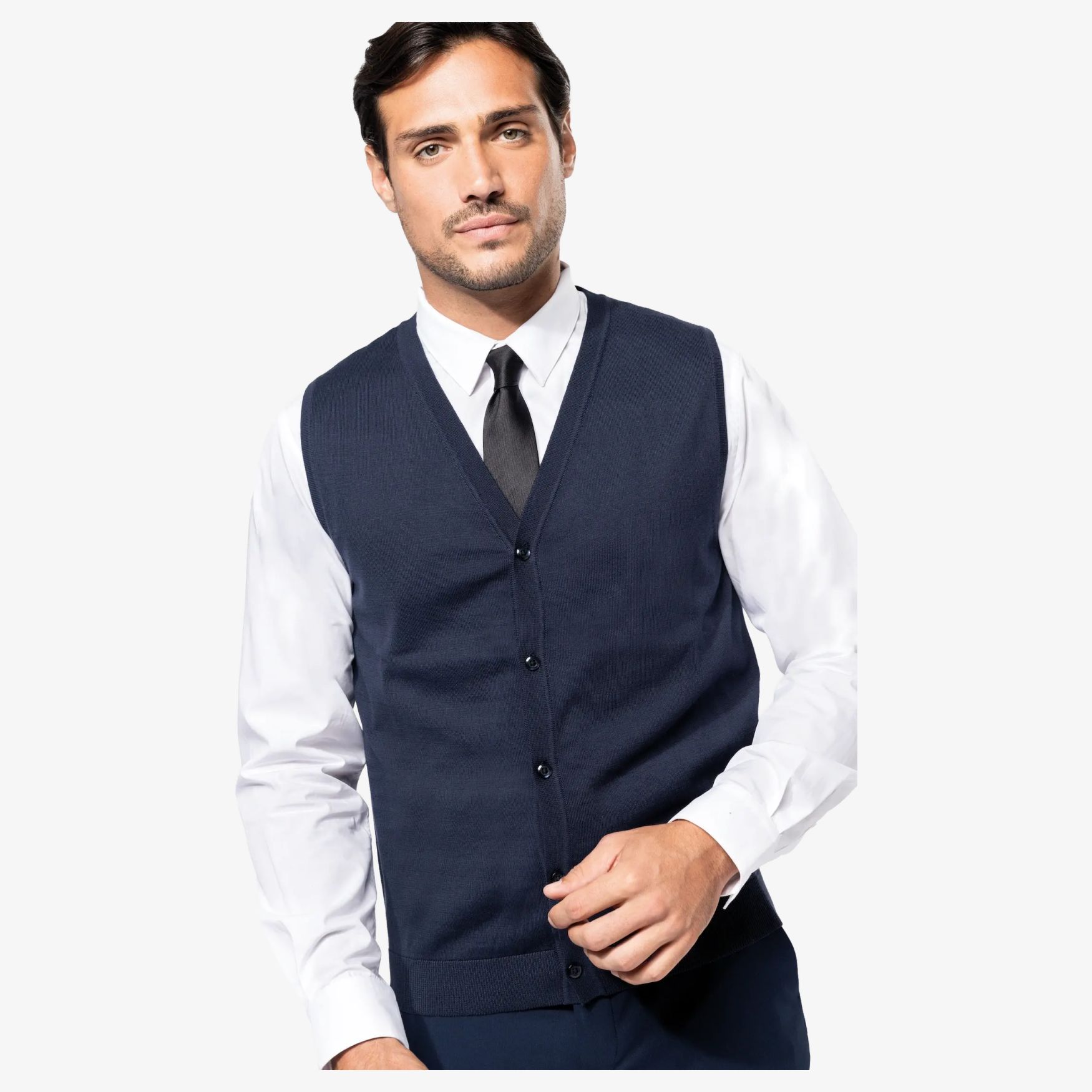 De Gilet Supima Homme is een vest van gekamd katoen met getailleerde pasvorm en steekverhouding 12. In vorm gebreide afwerking en assemblage op linkingmachine. Hals, knopenlijst en onderboord in 1x1 rib, armsgaten gevoerd. Ton-sur-ton knopen.