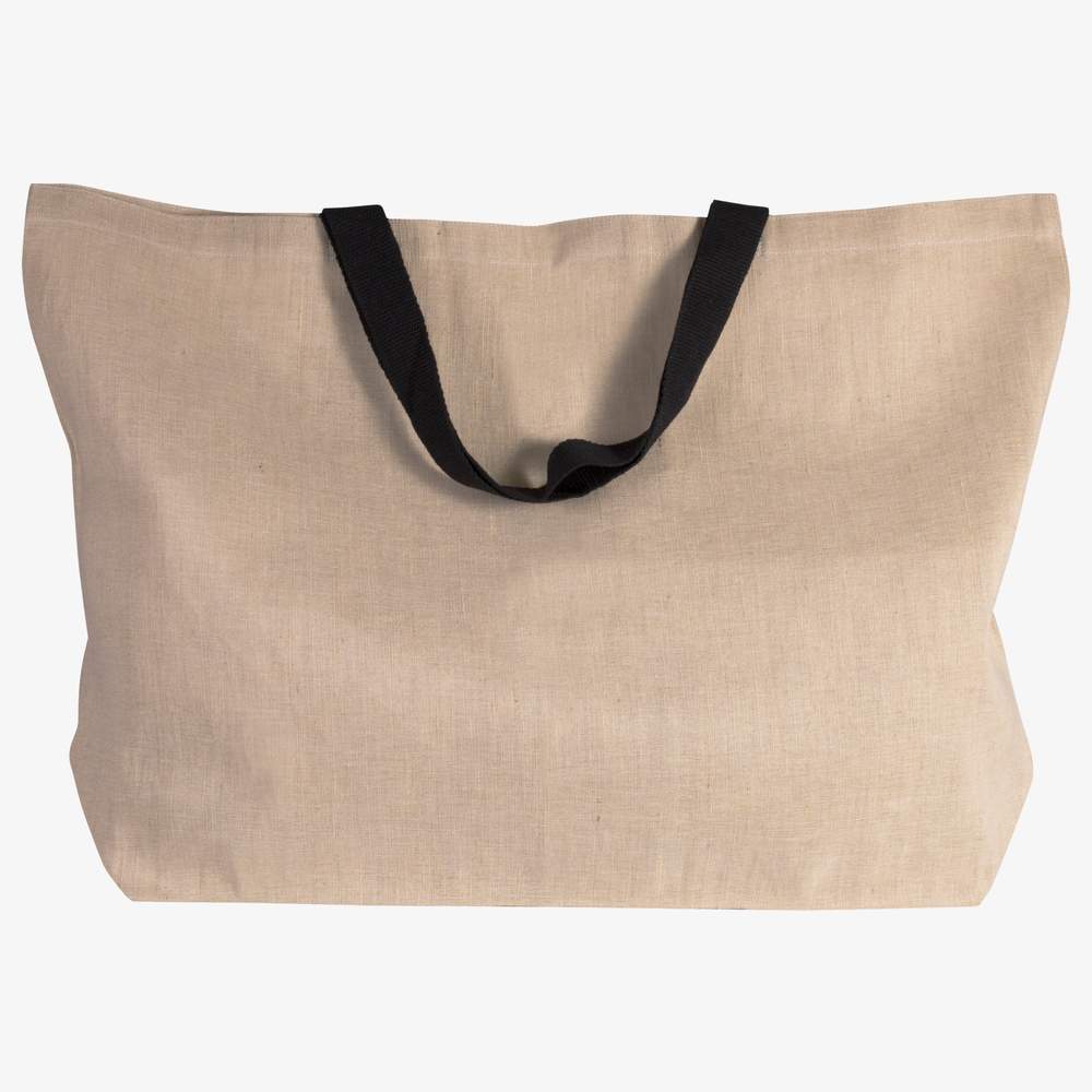 Grote zak in jute en katoen (jucot), met vouw en handgrepen van 55 cm contrastkleur. Afmetingen: 72x15x48 cm.