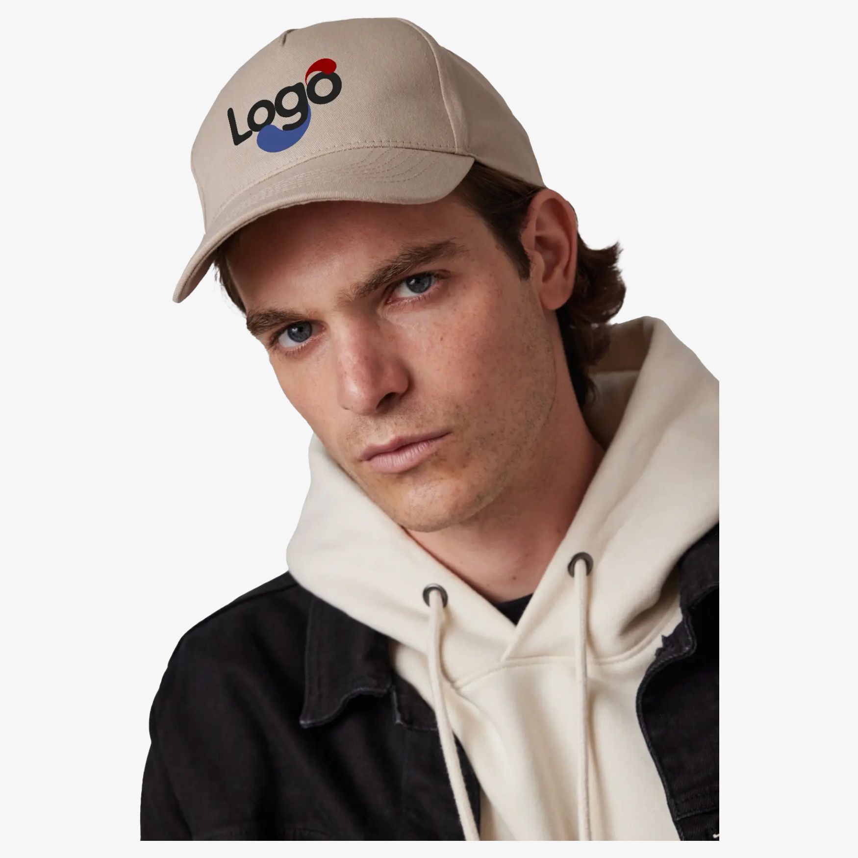 De casquette 5 panels combineert gerecycled keperkatoen en gerecycled polyester. Het heeft een verstelbare sluiting met klittenband. De traceerbaarheid wordt gewaarborgd door een QR-code gekoppeld aan blockchaintechnologie.