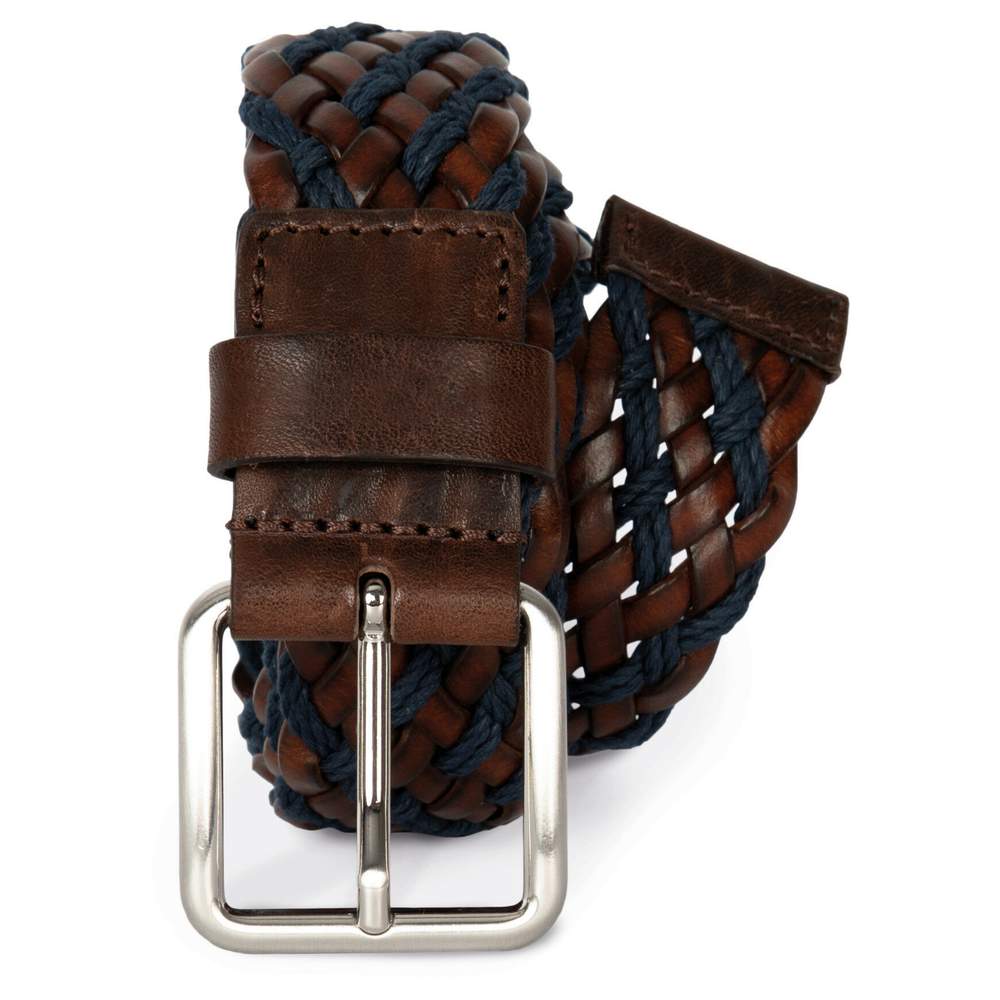 Deze riem is gemaakt van herstel leder en katoen, biedend een kleurcontrast. Zijn gevlochten ontwerp garandeert robustheid en een zorgvuldig uiterlijk. Het is beschikbaar in twee lengtes om aan een variëteit aan lichaamsvormen te voldoen.