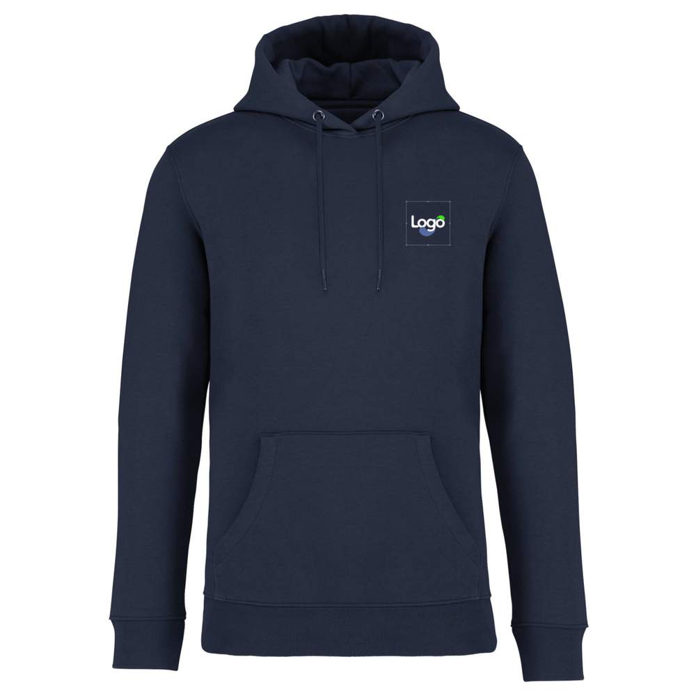 Unisex hoody in geribbelde molton 3-fils LSF (Low Shrinkage Fleece: pre-shrunk fleece). Passend model met kangoeroezak, gestreepte rand 1x1 aan de onderkant van het kledingstuk en aan de mouwen. Dubbele naad aan de mouwen, oksels, onderkant van het kledingstuk en half maan. Bandje van binnen voor schoonheid in ruggensteun en kap met hoofdmateriaal met stoppunt. Ronde koord met uiteinden en metalen oogjes gerecycled. Samengesteld uit: 85% gepelde biologisch katoen ringspun en 15% gerecyclede post-consumer polyester. Mogelijkheid tot personalisatie door middel van borduurwerk of uw logo.