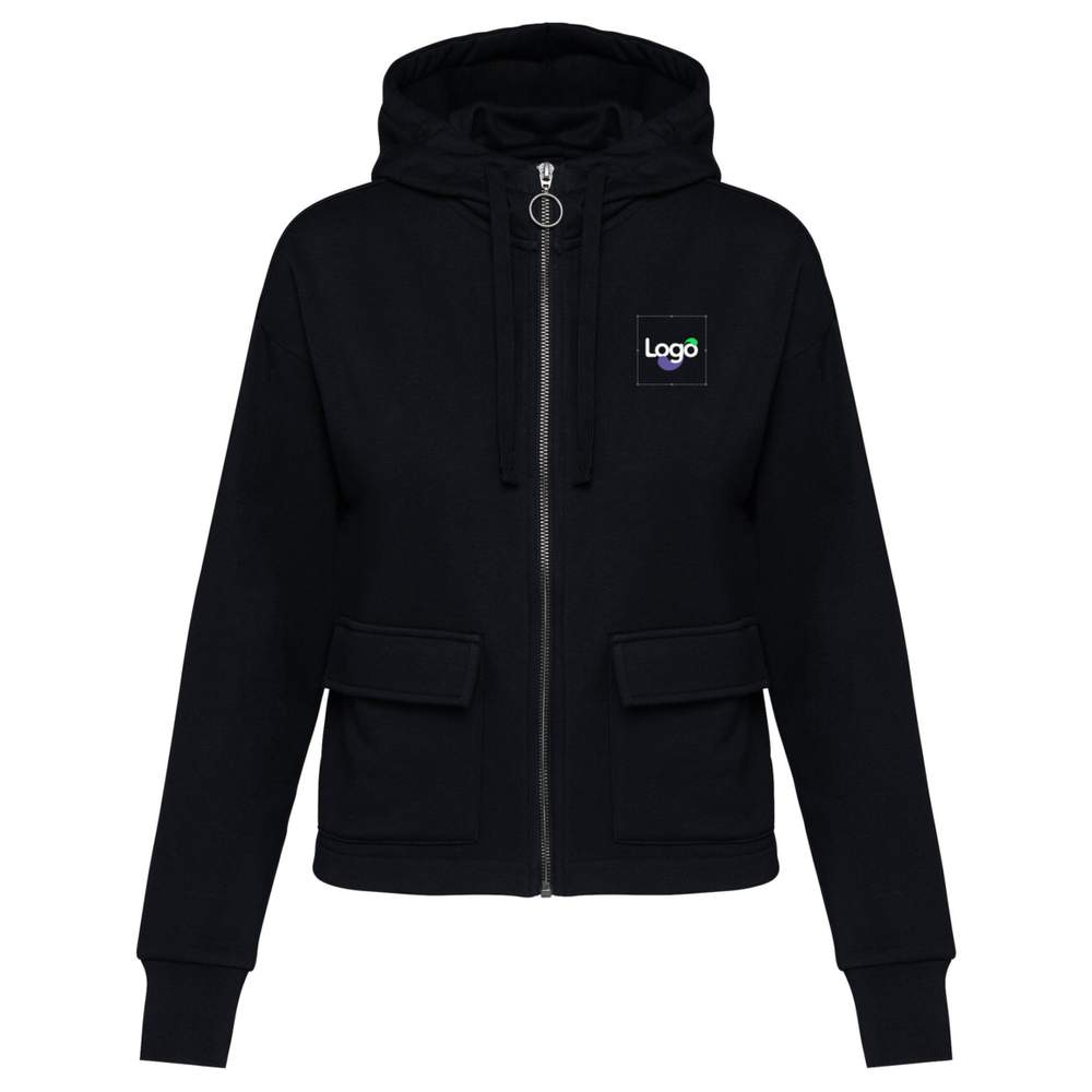 Vrouwelijke zip hoodie. Ruime pasvorm en hangende schouders. Ongegratte fleece (French Terry) 3-dradig LST (Low Shrinkage Terry: voorgekruld). Halfmaan op de rug. Enzymatisch gewassen. Zip van gerecycleerd metaal met een afgeronde trekker. Twee geplaatste zakken vooraan met klap. Capuchon met klem met een inlay van het hoofddoek. Plat trekkoord van biologische katoen. Inwendige schouderband in chevrons. Afwerking van de mouwopening in rib 1 x 1. Afwerking van de onderkant van het kledingstuk met een enkele naad. Afwerking van de binnenkant van de zip met een schone rand in jersey. Samenstelling: 85% biologische katoen, 15% gerecycleerd polyester post-consumer. Mogelijkheid tot aanpassing door broderie.