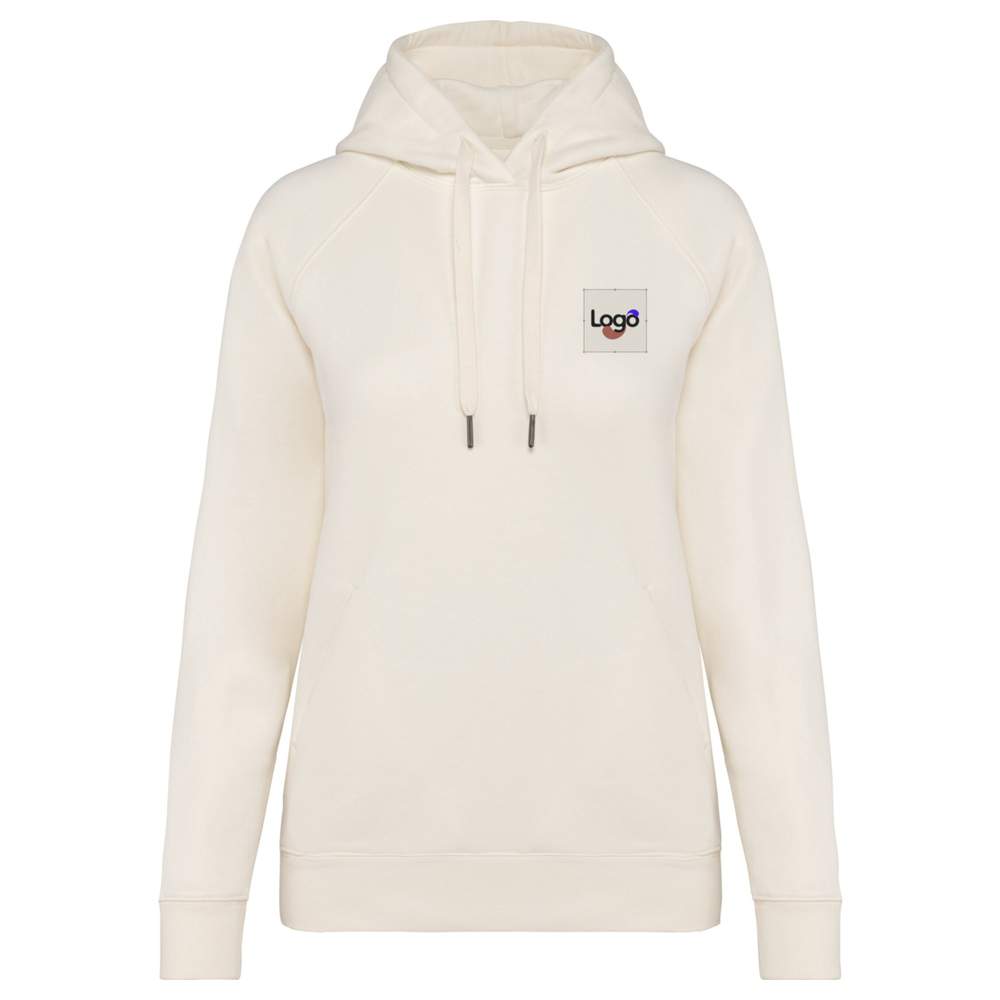 Vrouwelijke raglan capuchon sweat. Comfortabele pasvorm met raglan mouwen. Gewreven fleece. Gereinigd met enzymen. Omslagpunten aan de mouwen, zijden, onderkant en mouwonderkant. Twee zijzakken, capuchon gedubbeld in hoofdmateriaal, halfmaan op de rug. Platte touwtjes met gerecycled metalen uiteinden. Krag met binnenband van jersey. Bordure van 1*1. Samenstelling: 65% biologische peignage katoen en 35% gerecycled polyester. Mogelijkheid voor broderen.