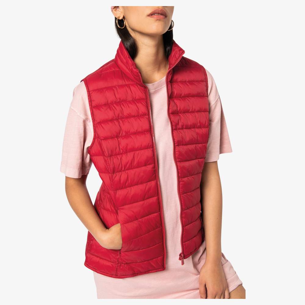 Lichte gerecycleerde bodywarmer voor dames. Recht gesneden, licht getailleerd. Staande kraag. Zachte en gladde aanvoeling. Waterafstotend niveau 4 en winddicht 4mm/s. Gezippte zijzakken en binnenzakken in recyclebaar nylon. Voorzijde iets langer dan achterzijde. Met opbergtas geleverd. Vulwerk met een duwveffect van 50% Sorona® en 50% gerecycleerd polyester. Sorona® is een merknaam van Affiliates of DuPont de Nemours, Inc., gebruikt onder licentie. Samenstelling: 100% gerecycled polyamide.