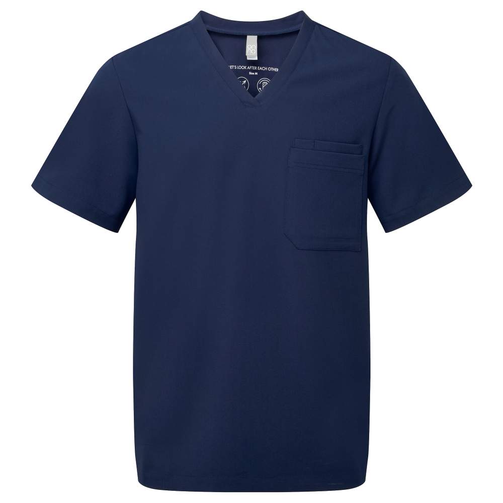 Korte mouwen medische tuniek voor mannen, ontworpen voor optimaal comfort. Het viervoudig rekbare weefsel zorgt voor een verhoogde beweegvrijheid. Deze tuniek is luchtdoorlatend, gemakkelijk te onderhouden en kreukvrij, ideaal voor dagelijks gebruik. Het heeft een V-halslijn, een ingelegde centrale zak met een penzak, plooien op de rug en zijspleten voor een moderne en passende pasvorm. De samenstelling omvat gerecycled polyester, wat bijdraagt aan een verantwoordelijker benadering.