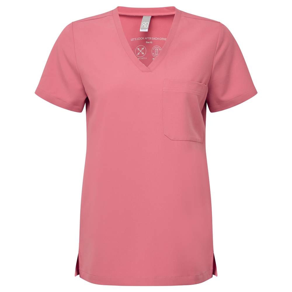 Medische tuniek met korte mouwen voor vrouwen, ontworpen om comfort en functionaliteit te bieden. Het vierzijdig strekbare weefsel zorgt voor optimale beweeglijkheid. Deze tuniek is luchtdoorlatend, wat helpt bij het reguleren van de lichaamstemperatuur, en staat bekend om zijn eenvoudige onderhoud en krimpvrije uiterlijk. Het heeft een V-halslijn, een enkele ingelegde zak met een zak voor een pen, evenals discrete vouwen aan de achterkant en zijspleten voor een moderne en comfortabele pasvorm. De samenstelling omvat gerecycleerd polyester, wat bijdraagt aan een duurzamere benadering.