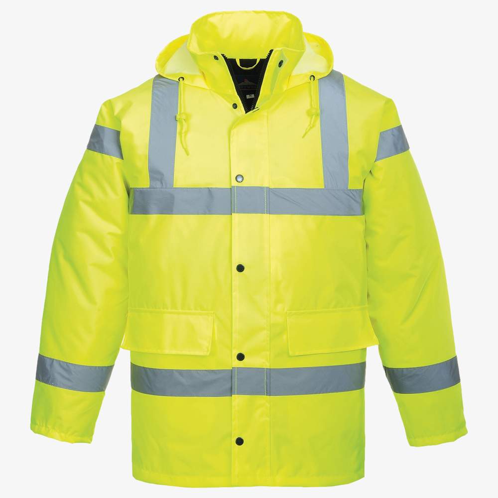 Deze hoge zichtbaarheid veiligheidsjas is ontworpen om extra bescherming te bieden in eisenvolle werkomgevingen. Het is gemaakt van polyester geëxtrudeerd PU, wat extra weerstand biedt tegen weersinvloeden en duurzaamheid. De jas is voorzien van twee zakken met klap en kleverige band sluiting, waarmee persoonlijke spullen veilig kunnen worden opgeborgen. Een kap en een onderrand met treksnoer bieden extra comfort. De waterdichte naden bieden extra bescherming tegen regen en vocht. Een voorste tweerichtingszip maakt het eenvoudiger om de jas aan- en uit te doen. Een binnenste zak en een zak voor telefoon houden essentiële spullen binnen handbereik.