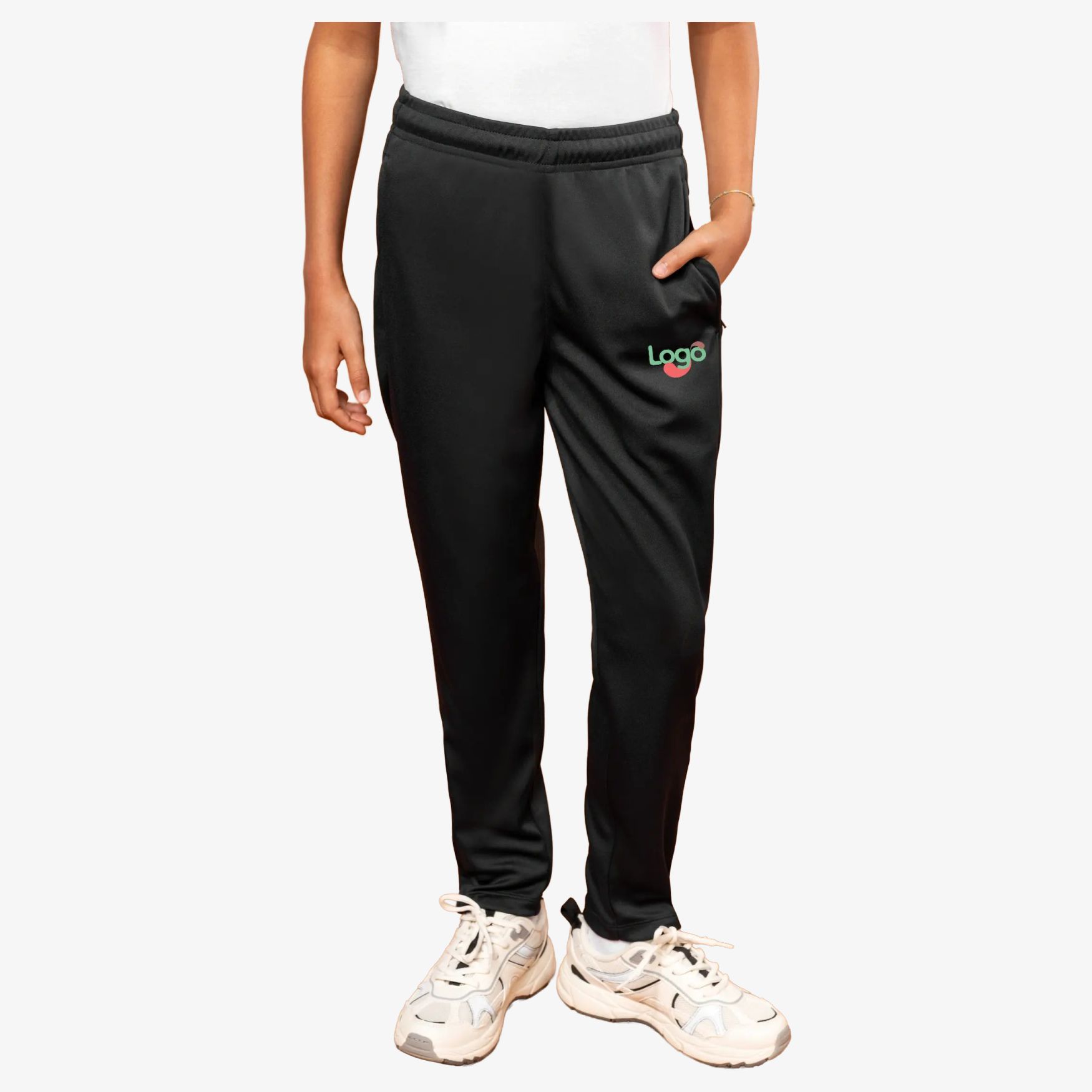 De kinderen trainingsbroek is gemaakt van matte polyester interlock. Het heeft een elastische tailleband met een ronde trekkoord met rubberen uiteinde aan de binnenkant. Twee zijzakken zijn voorzien van ritssluitingen. De onderkant van de pijpen heeft een ritssluiting met dubbele naald zoom. Een afneembare label maakt personalisatie mogelijk.