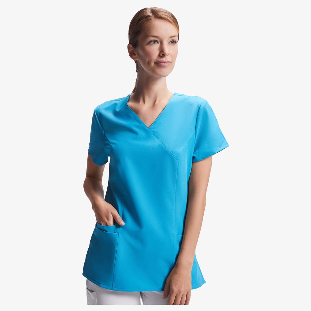 Korte mouwen blouse voor vrouw. Kruis-V-hals. Twee Franse zakken. Losneembare etiket. Samenstelling : 94% polyester, 6% elasthaan. Blouse om te combineren met de broek FIBER.