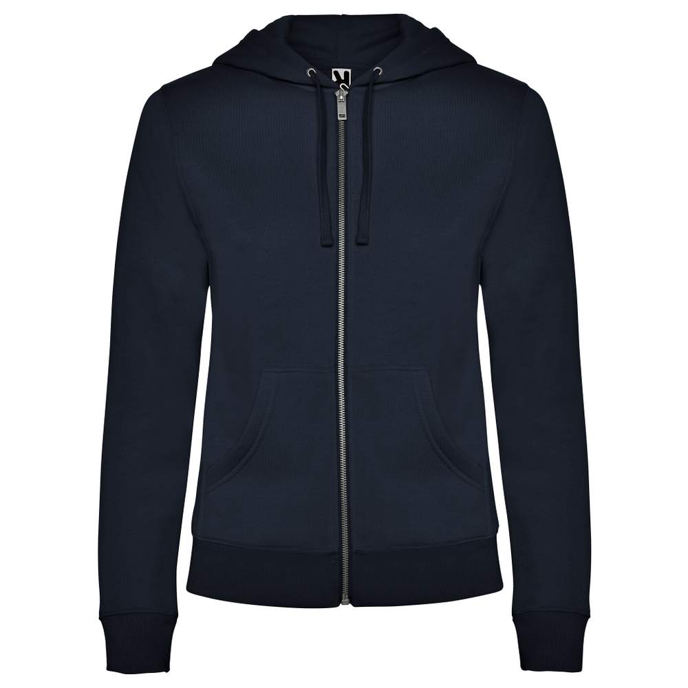 Sweatshirt voor dames met gevoerde muts in dezelfde kleur. Vooraanzicht met metallische zip en kangoeroezak. Versterkte band aan de binnenkant van de hals. Manschette en tailleband in ribbel 2x2. Strakke passeerform.