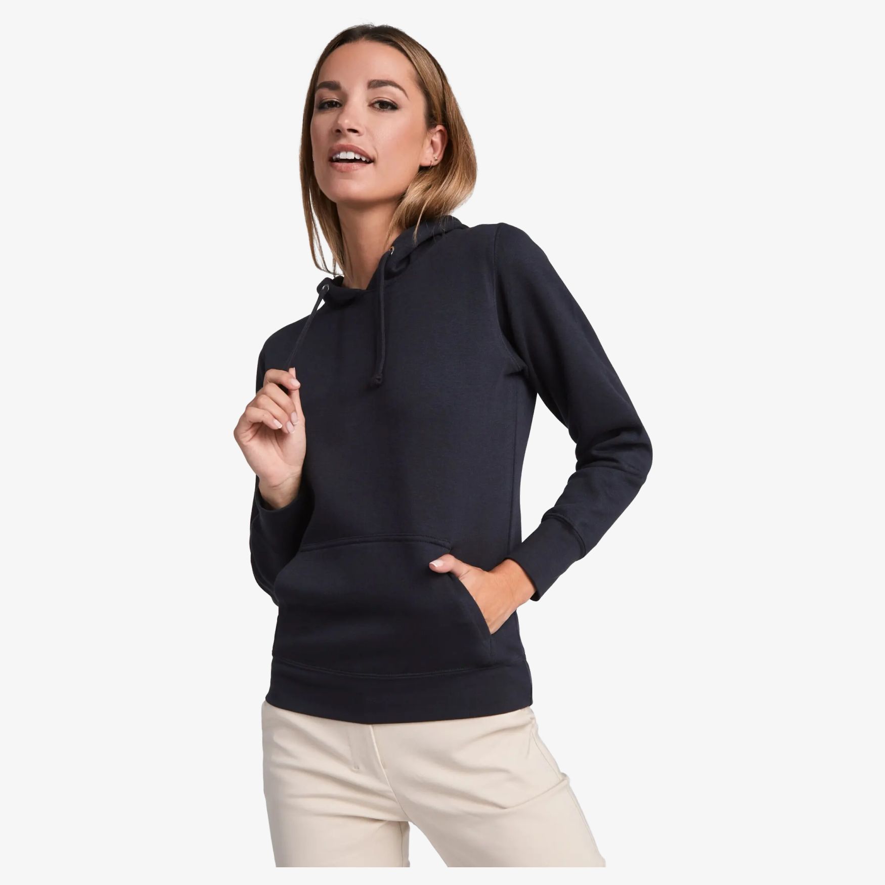 Sweatshirt voor dames met strakke pasvorm. Dubbele capuchon met contrast en ton van het trekkoord en kangaroo pocket. Versterkte propretéband in chevronweefsel voor de kraag. Mancheten en randen cotê 1x1 met elastane. Manchet met knoopsgatopening voor duim. Afneembare label. Duo Concept.