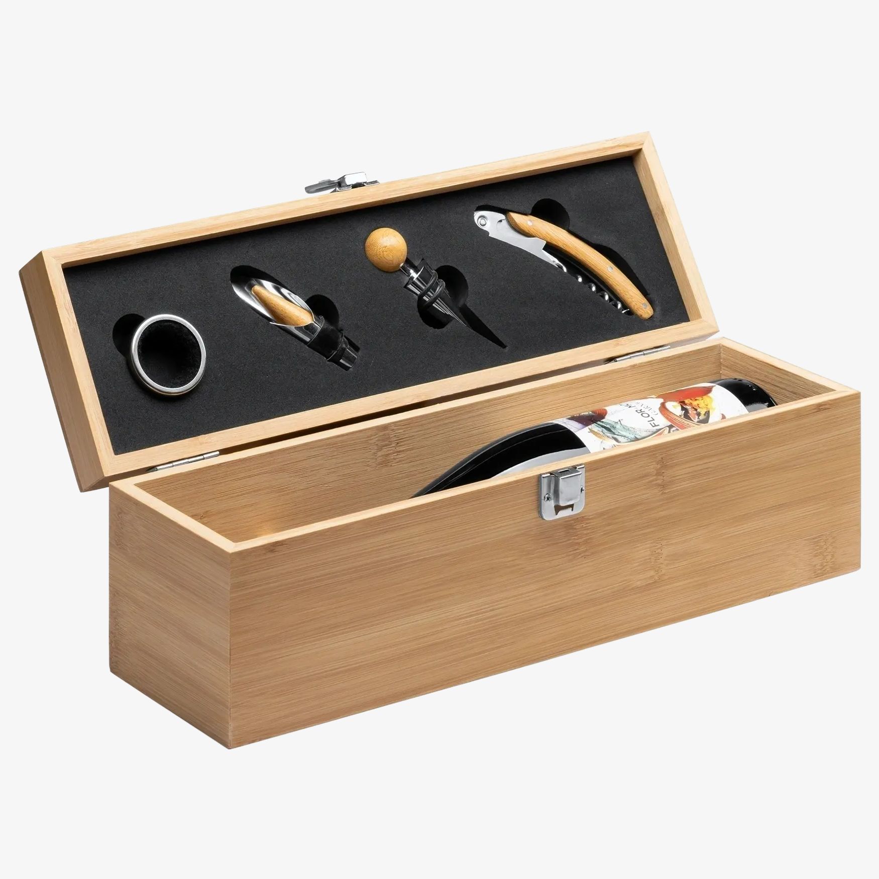 De Bordel wijnkist maakt het mogelijk om een fles wijn te vervoeren en te presenteren met een speciale opbergruimte en een gevoerde binnenkant. Het deksel bevat accessoires voor openen en serveren.