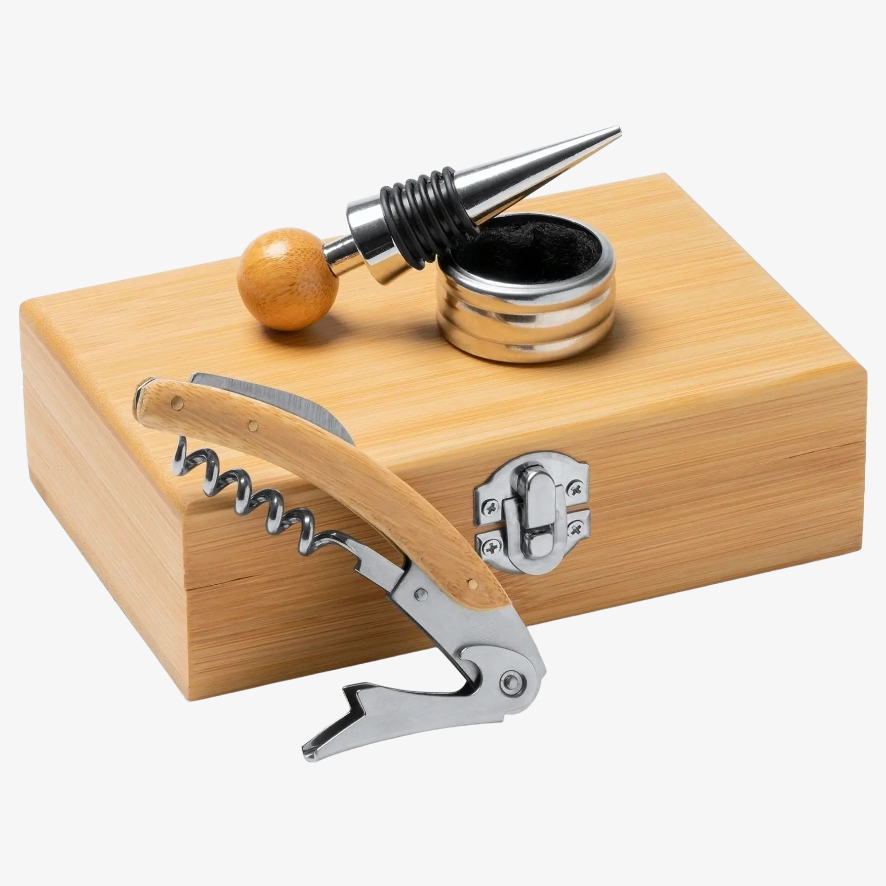 De Tintos wijnset bevat accessoires voor openen en serveren, met kurkentrekker-flesopener met inklapbaar mes, stop en druipring. Bamboe etui met gewatteerde binnenvoering.
