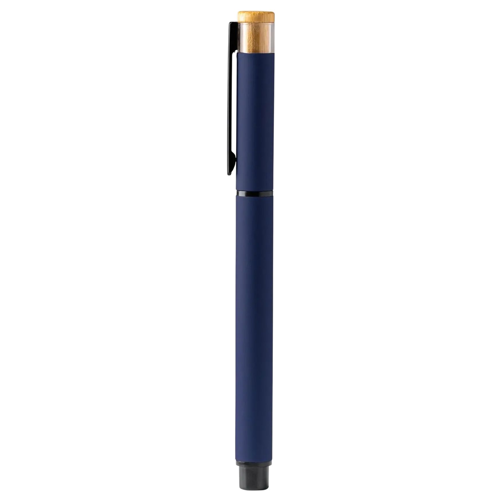 De Lindberg balpen van gerecycled aluminium met metalen clip en bamboedetail is geschikt voor dagelijks schrijven. Blauwe jumbo-inktpatroon.