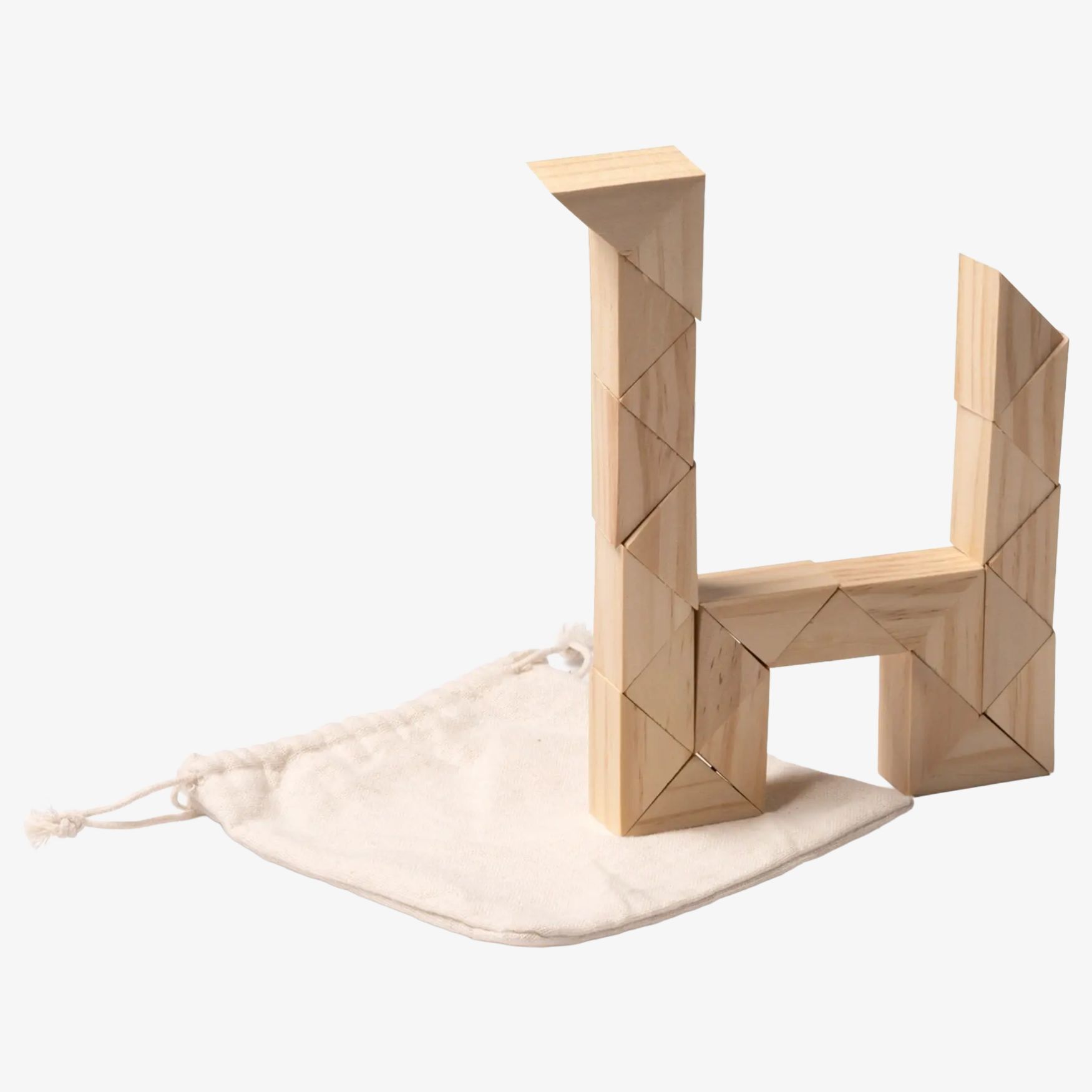 De houten puzzel NOKIT bevat 24 stukken en wordt geleverd in een katoenen opbergzak. De afmetingen zijn 11 x 10,5 x 2 cm.