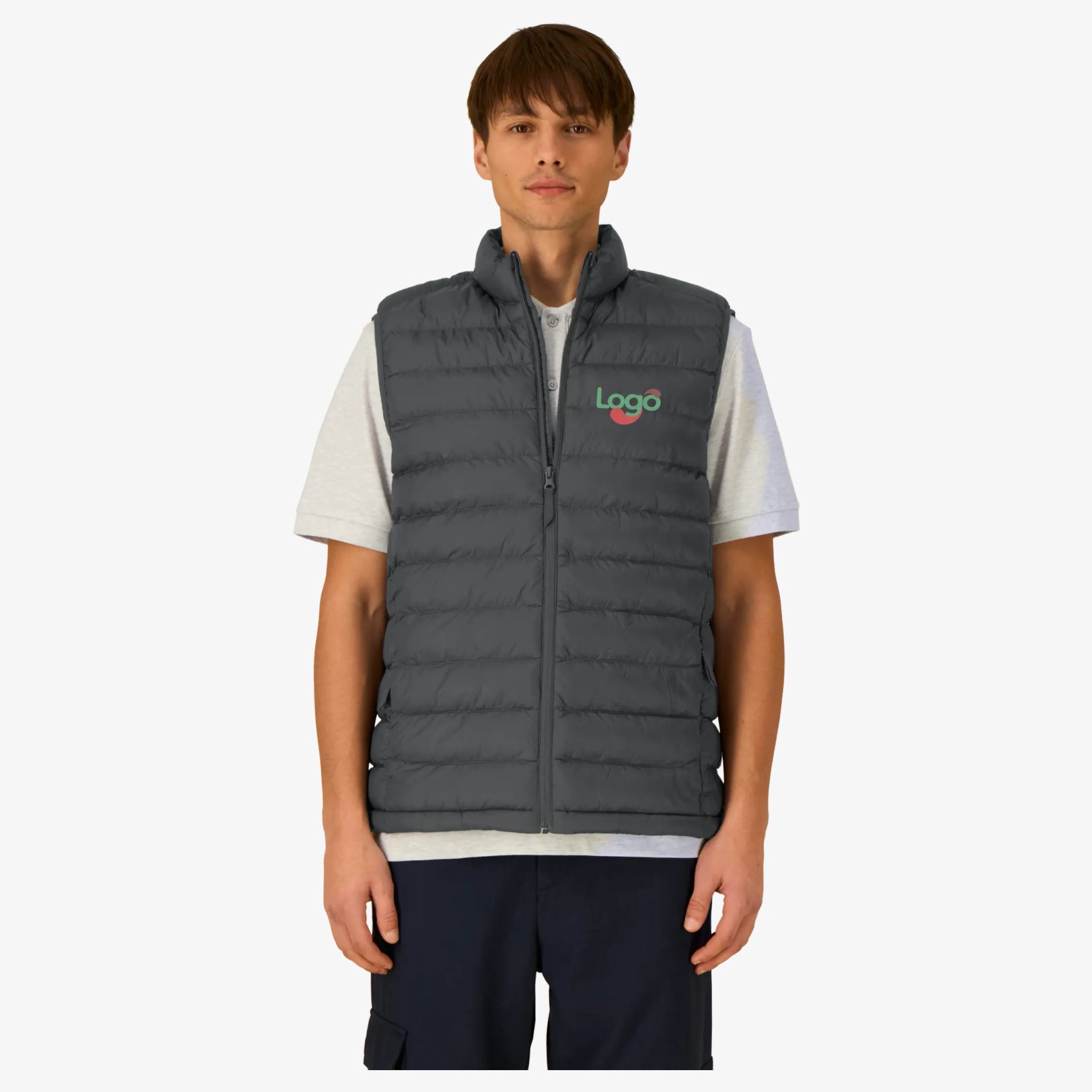 Het mouwloze jack voor mannen is gemaakt van gerecycled nylon. Het heeft een opstaande kraag en een centrale ritssluiting aan de voorkant. De zakken zijn met bies afgewerkt en hebben een ritssluiting met grosgrain trekker. Het model is volledig gewatteerd met inzetstukken aan de zijkanten voor betere pasvorm. De binnennaden zijn afgewerkt met een bies. De onderste zoom heeft een kunststof stopper met een verstelbaar elastisch trekkoord.