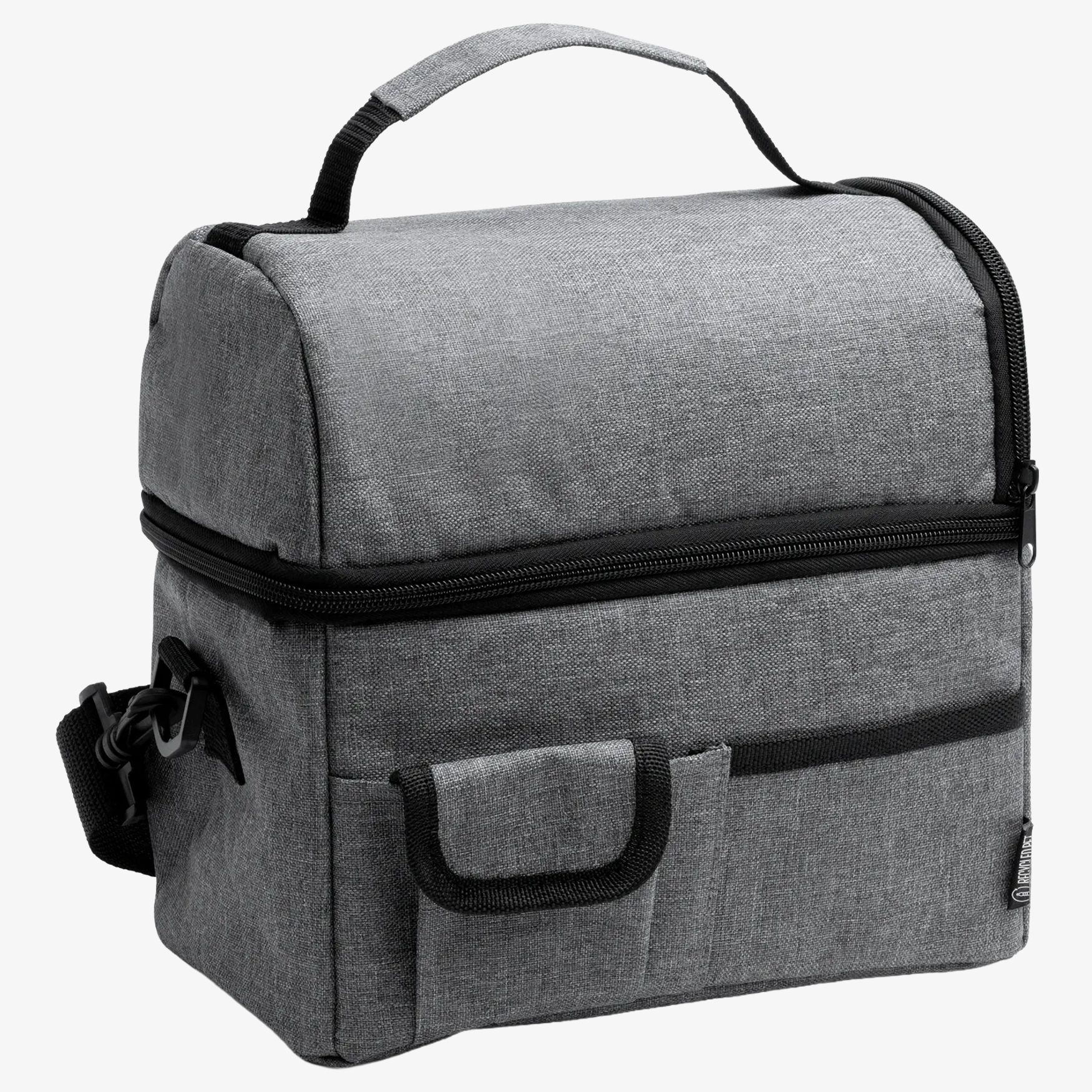 De geïsoleerde tas KUNES gemaakt van RPET 600 D bewaart voedsel en dranken op temperatuur tijdens het vervoer. Bevat geïsoleerde compartimenten en buitenvakken voor extra opslag. De verstelbare gevoerde draagriem vergemakkelijkt het transport.