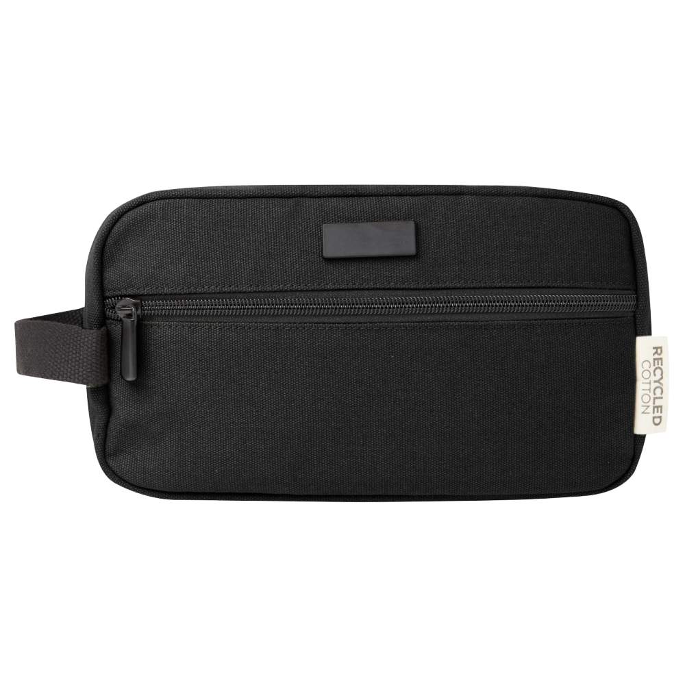 Reisaccessoires tasje in gerecycled doek en RPET voering. Met een voorzijde zakje met ritssluiting en een hoofdcompartiment met ritssluiting, zijkantzakjes, en een comfortabele band. Plaatje decoratief metaal afwerking subtiel en mat. Capaciteit: 3,5 liter. Afmetingen: 23 x 11 x 13,5 cm. Samenstelling: 80% gerecycled katoen, 20% katoen