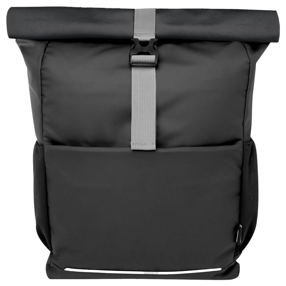 Waterbestendige fiets tas met wieltjes, gemaakt van gerecyclede materialen. Het heeft een gevoerde compartiment voor een laptop van 15 inch, meerdere opslagzakken, een aanpasbare sluiting met haak-en-lus om het gemakkelijk op verschillende fietsen te installeren, en reflecterende banden voor beter zichtbaarheid. De gerecyclede materialen omvatten het hoofddoek, de bekleding, de riem en de ritssluitingen. Capaciteit: 20 liter. Geen PVC. Afmetingen: 30 x 14 x 57 cm. Samenstelling: gerecycled polyester.