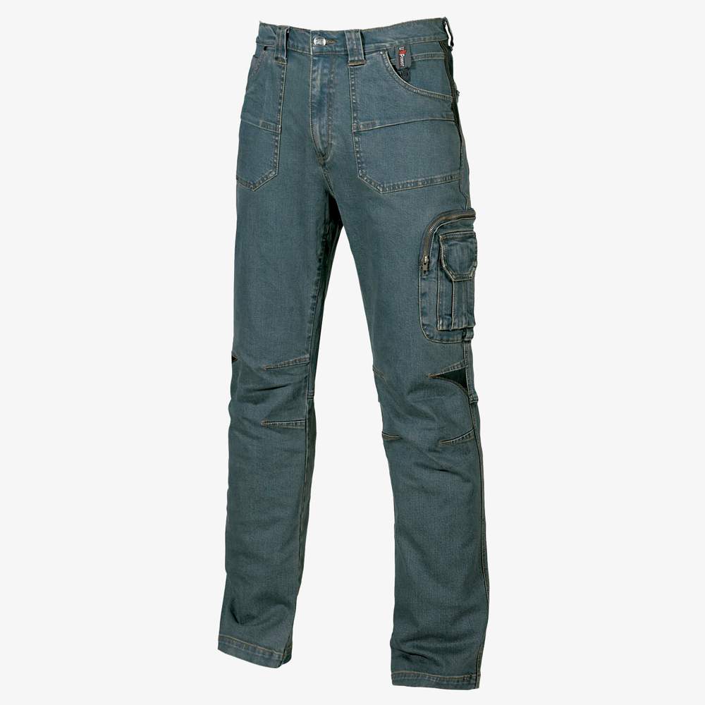 Elasthan denim jeans met twee grote Italiaanse zakken aan de voorkant met stretch technische flap, muntzak, zijdelijke gereedschapszak, multifunctionele zijzak met telefoonhouder en terugtrekbare badgehouder, twee achterzakken, een met een zip, een hamerhoes. Stretch inserts op het niveau van het bekken en de knie, aanpasbare taille met zelfklevende band. Drievoudige naden. Deze broek biedt een combinatie van functionaliteit en comfort voor verschillende professionele toepassingen.