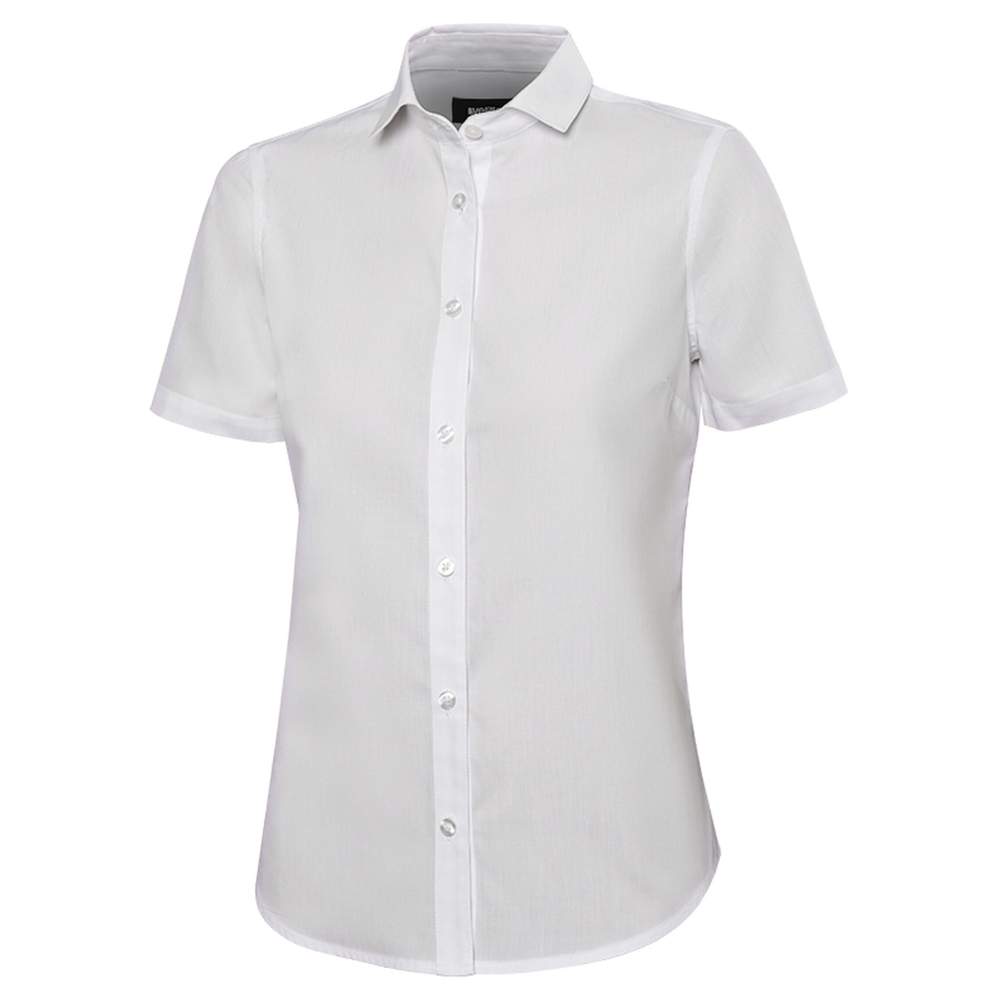 Vrouwelijke chemisette gemaakt van polyester en katoen. Het heeft een knopsluiting met flap en een Italiaanse kraag. Een inset in de rug en voor- en achterpincet dragen bij aan een gecintrude passvorm. Een extra knop is inbegrepen.