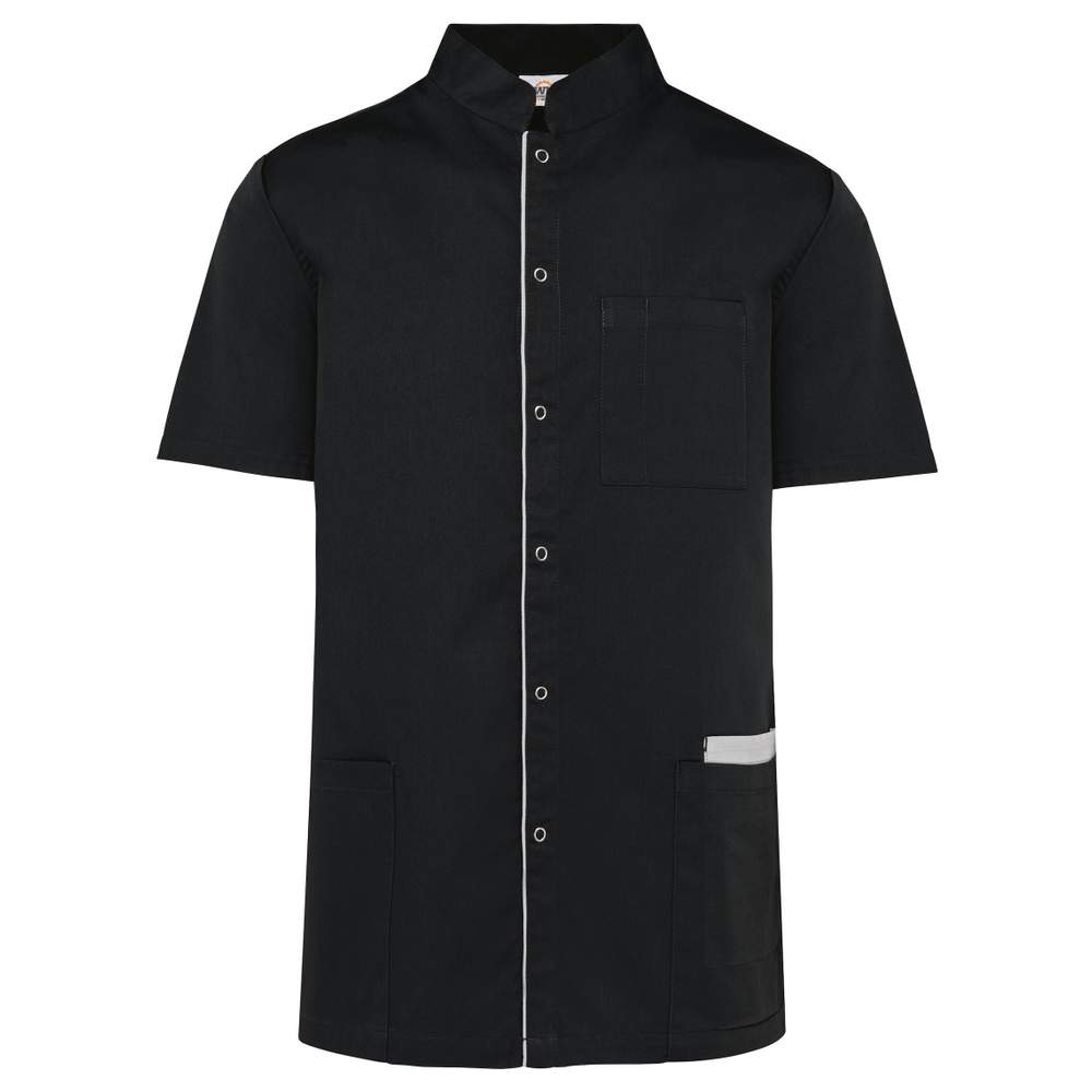 Keukenhemd gemaakt van polycoton met een aangepaste pasvorm. Het heeft een mandarijnkraag en een voorste sluiting met drukknopen. Er is een geplakte borstzak aan de linkerkant met een vak voor een pen, evenals twee grote geplakte voorzakken, waarvan één aan de rechterkant met een dubbel vak en een contrasterende rand. Een contrasterende passepoil benadrukt de sluitlap en het rugstuk. Een etiquet om de naam aan te geven is aanwezig aan de binnenkant van het kledingstuk, evenals een verwijderbare merketiket.