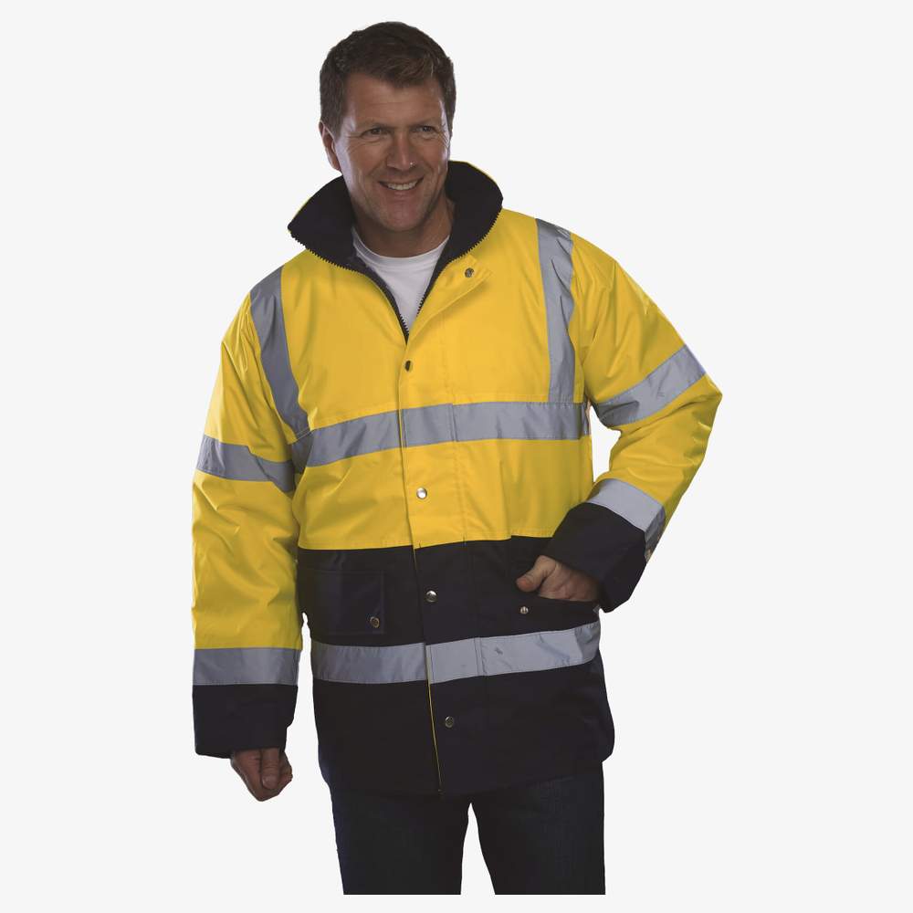 Deze tweekleurige veiligheidsjas biedt een verbeterde zichtbaarheid bij weinig licht. Het is ontworpen met wattendons en een nylon voering voor optimale comfort. De reflecterende banden van 3M, rond het lichaam, de armen en schouders, verbeteren de zichtbaarheid. De jas heeft een extra sterke ritssluiting met een stormflap en drukknopen voor extra bescherming. Er zijn twee buitenzijdige zakken met stormflap en een binnenzak op borsthoogte. De stormbeschermende polsbanden en de ingebouwde kap in de kraag bieden extra bescherming tegen slecht weer. De genaaide en gelijmde naden zorgen voor perfecte waterdichtheid.