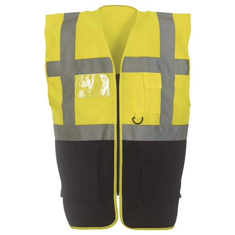 Deze multifunctionele hoogzichtbare jas biedt een uitstekende zichtbaarheid en functionaliteit. Het is uitgerust met reflecterende banden van 5cm breed rond het lichaam en op de schouders voor verhoogde veiligheid. Er is een zak voor telefoon of walkietalkie, evenals twee onderzakken met flapjes toegangbaar vanaf bovenaf en van de zijkant, inclusief zakken voor potloden en sleutelhangers. Een zak voor papieren is ook aanwezig aan de rechterkant, en een grote oppervlakte achteraan maakt decoratie mogelijk.