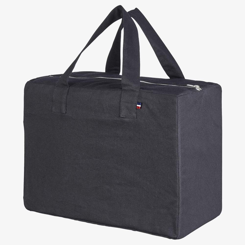 Wielka torba weekendowa, tkanina i wyprodukowana we Francji, wyposażona w metalowy zamykany błyskawicą. Ma uchwyty dwuwarstwowe z wzmocnionymi szwami i zawiera wewnętrzną kieszeń z etykietą "Wyprodukowane we Francji" z grubym ziarnem. Pas z trzema kolorami jest przymocowany do uchwytu. Tkanina jest sanforizowana dla lepszej odporności.