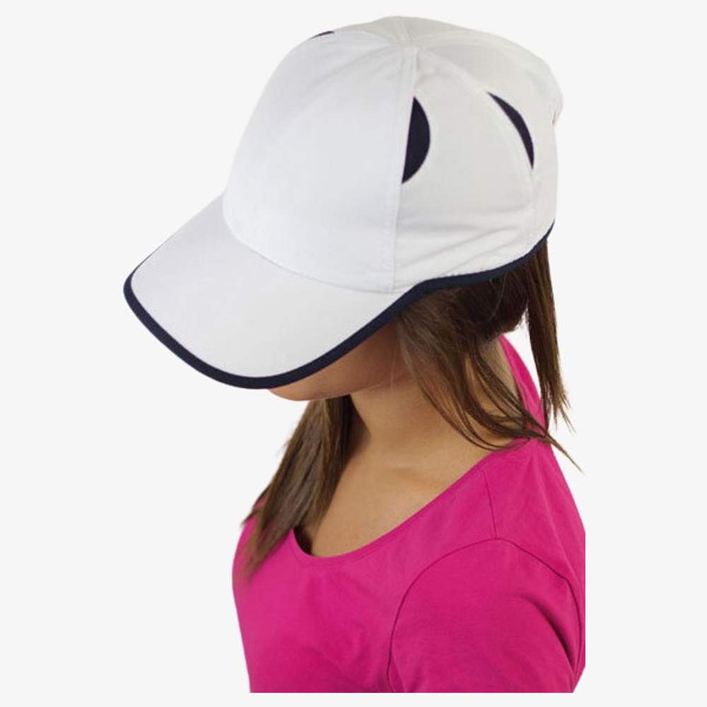 Czapka 6 panelowa. Wizjera wygięta. Wykończenie pasem kontrastowym. 4 wkładki wentylacyjne z siatki mesh. Opaska: 35% bawełna/65% poliestr. Zamknięcie pasem samoczepnym. Skład: 100% mikrofibra poliestrowa. Możliwość personalizacji hakiowaniem dla unikalnego i profesjonalnego wyglądu.