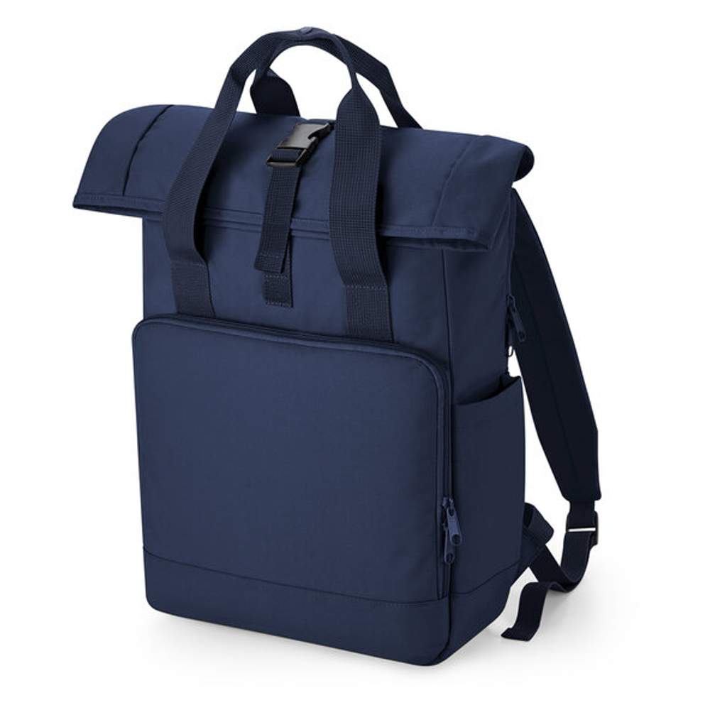 Torba plecaka zaprojektowana z systemem zamykania na rolkę. Wyposażona w uchwyty transportowe z pasem i regulowane, wyściełane rzemienie oraz wyściełoną tylną ścianę dla zwiększonego komfortu. Materiał główny to recyklingowy poliester, wyprodukowany z około 12 butelek po zużyciu. Zawiera wyściełoną wewnętrzną komórkę na laptop, zabezpieczoną i łatwo dostępną, kompatybilną z modelami do 15,6 cala. Wewnętrzna kieszeń z zamkiem błyskawicznym oferuje dodatkową przestrzeń do przechowywania. Przednia sekcja składa się z organizera kieszeni zaprojektowanego dla ułatwienia personalizacji. Boczna kieszeń jest dedykowana dla butelek. Torba jest wyposażona w odłączalną etykietę. Jej pojemność wynosi 19 litrów, a wymiary 30 x 44 x 14 cm. Składa się z 100% recyklingowego poliestru (600D).