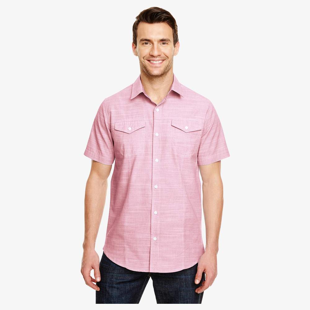 Ta koszula ma teksturę tkaniny w płótnie i jest wykonana z mieszanki bawełny i poliestru. Jest wyposażona w dwie kieszenie na piersiach z klapami i szwy na przodzie i krawędzi. Modele w kolorze niebieskim i czerwonym są wyposażone w kontrastowe wstawki kołnierzyka. Krój jest set-in z krótkimi rękawami.
