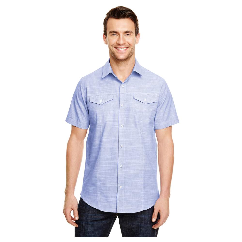 Ta koszula ma teksturę tkaniny w płótnie i jest wykonana z mieszanki bawełny i poliestru. Jest wyposażona w dwie kieszenie na piersiach z klapami i szwy na przodzie i krawędzi. Modele w kolorze niebieskim i czerwonym są wyposażone w kontrastowe wstawki kołnierzyka. Krój jest set-in z krótkimi rękawami.