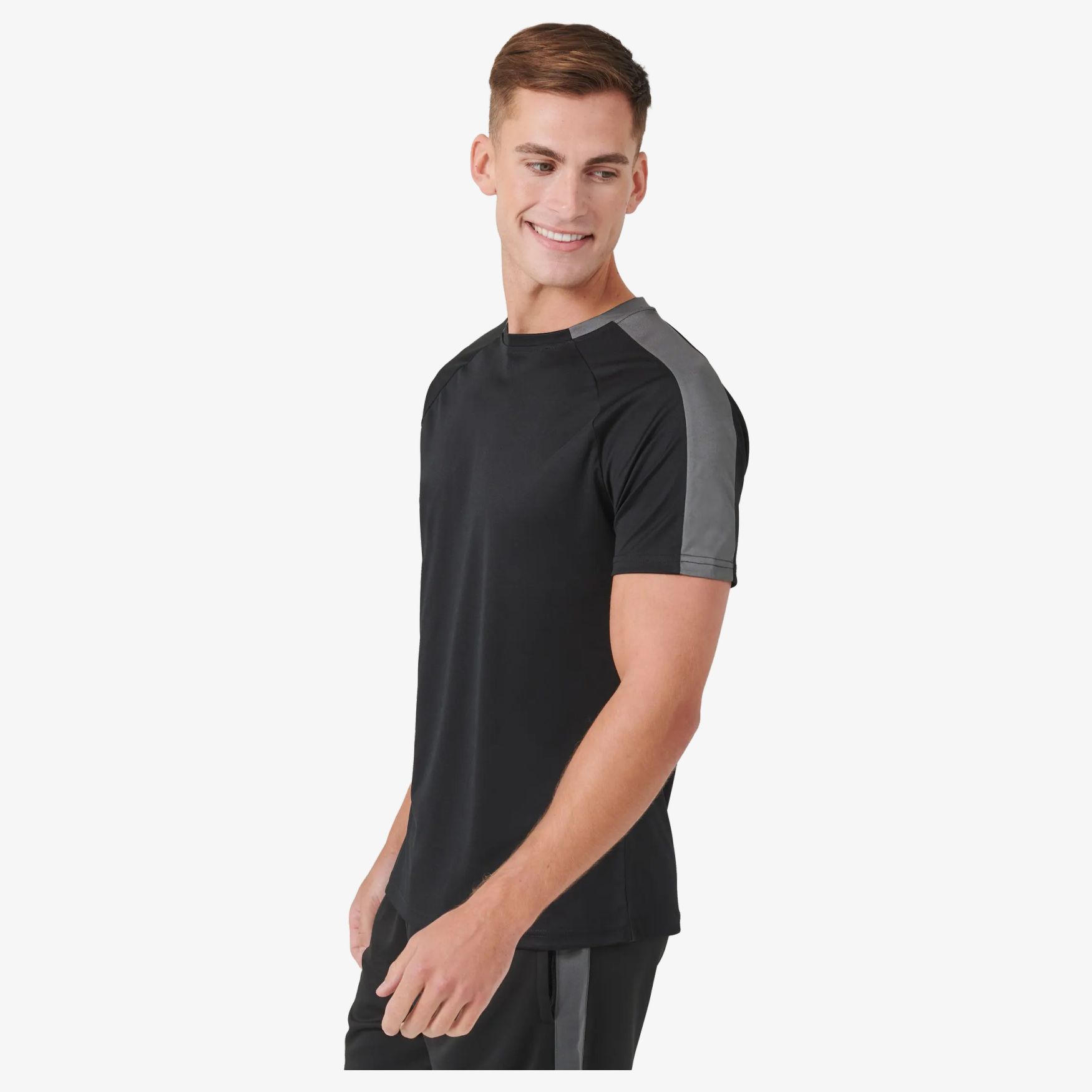 Unisex team t Shirt to tee-shirt drużynowy z rękawami raglanowymi i kołnierzem z 2 części. Oddychający materiał oraz kontrastowe pasy na ramionach (5 cm) sprawdzają się w zastosowaniach sportowych i zespołowych. Wykończenie z estetycznymi szwami oraz podwójnymi szwami na rękawach i u dołu.