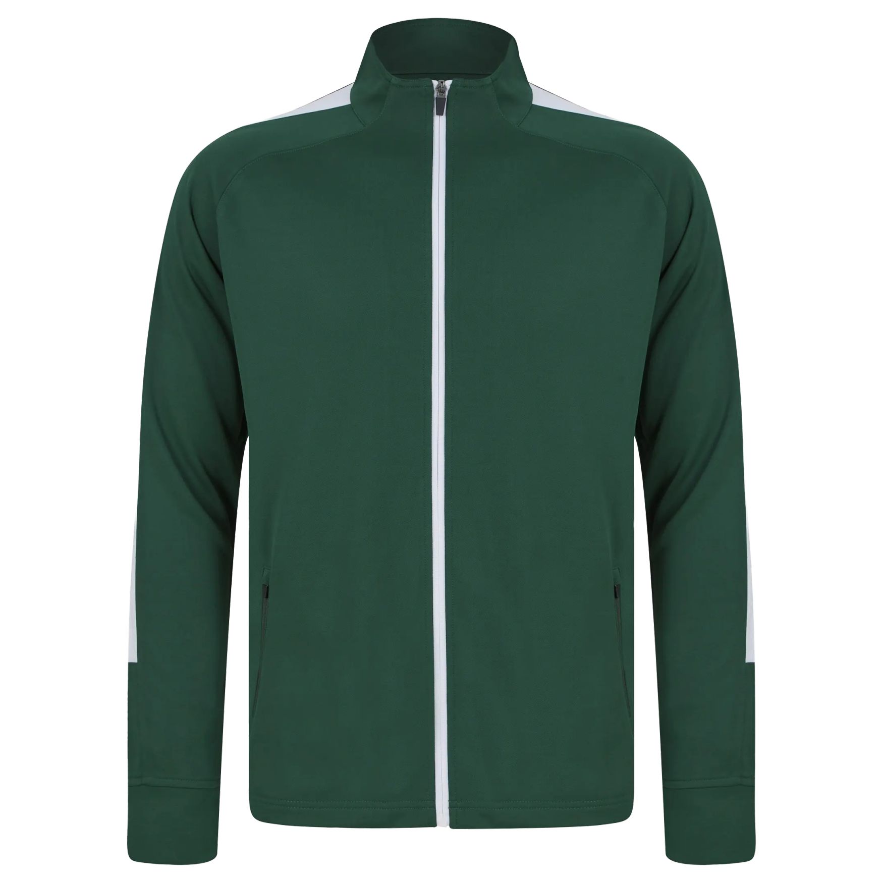 Dzianinowa bluza dresowa to dziecięca kurtka sportowa z kontrastowym zamkiem błyskawicznym, kontrastowymi pasami na ramionach i rękawach, bocznymi kieszeniami na zamek, kołnierzem typu stójka i ścigaczowymi mankietami.
