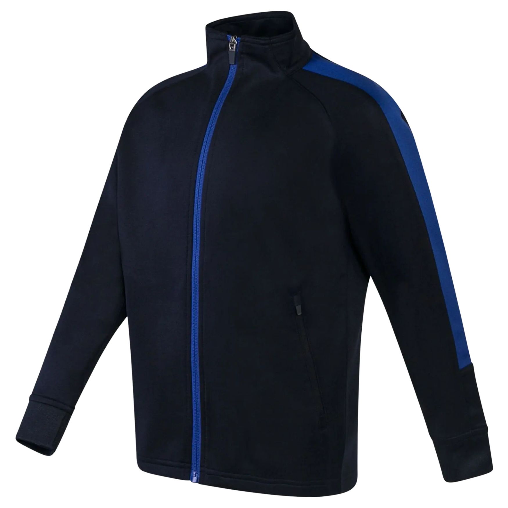 Dzianinowa bluza dresowa to dziecięca kurtka sportowa z kontrastowym zamkiem błyskawicznym, kontrastowymi pasami na ramionach i rękawach, bocznymi kieszeniami na zamek, kołnierzem typu stójka i ścigaczowymi mankietami.