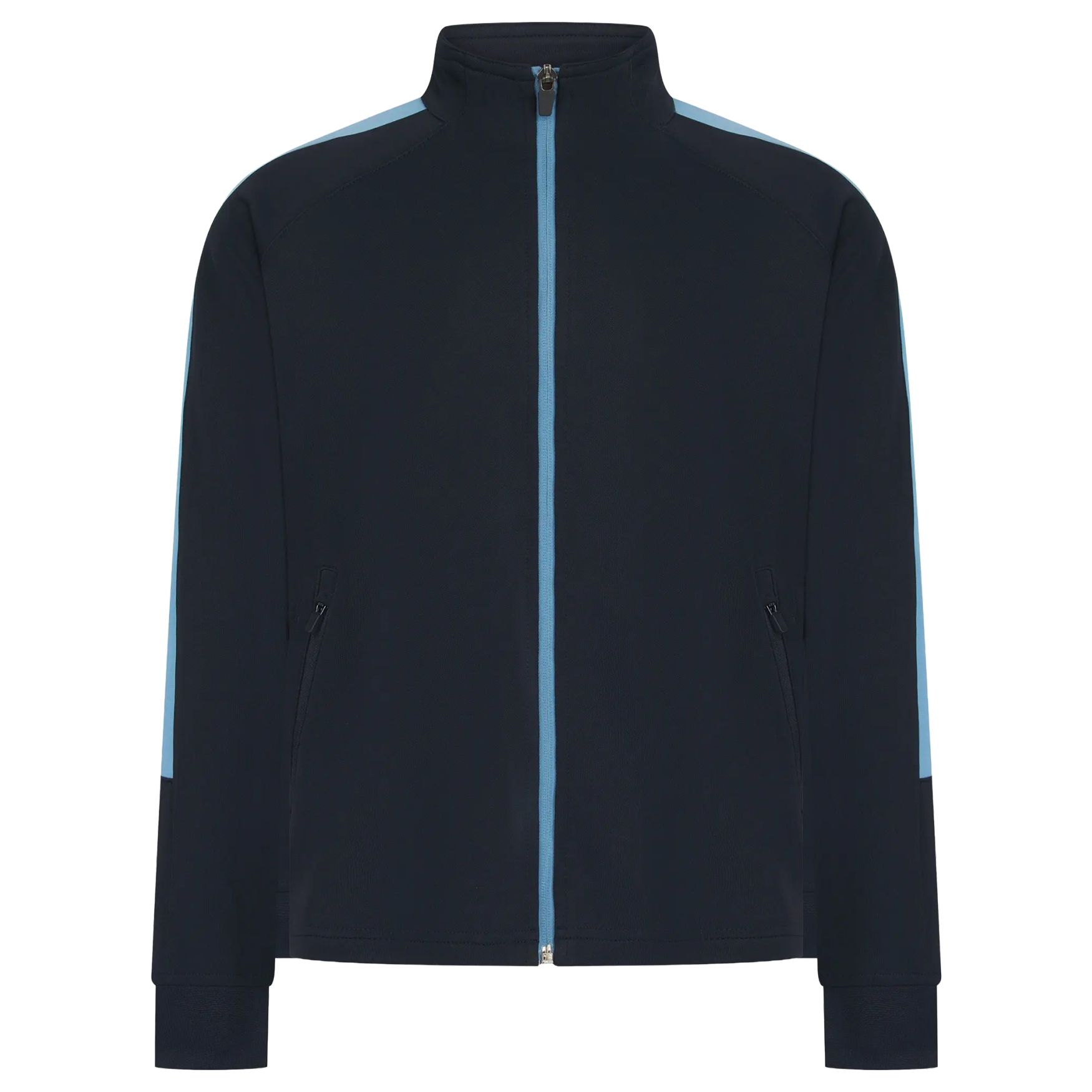 Dzianinowa bluza dresowa to dziecięca kurtka sportowa z kontrastowym zamkiem błyskawicznym, kontrastowymi pasami na ramionach i rękawach, bocznymi kieszeniami na zamek, kołnierzem typu stójka i ścigaczowymi mankietami.