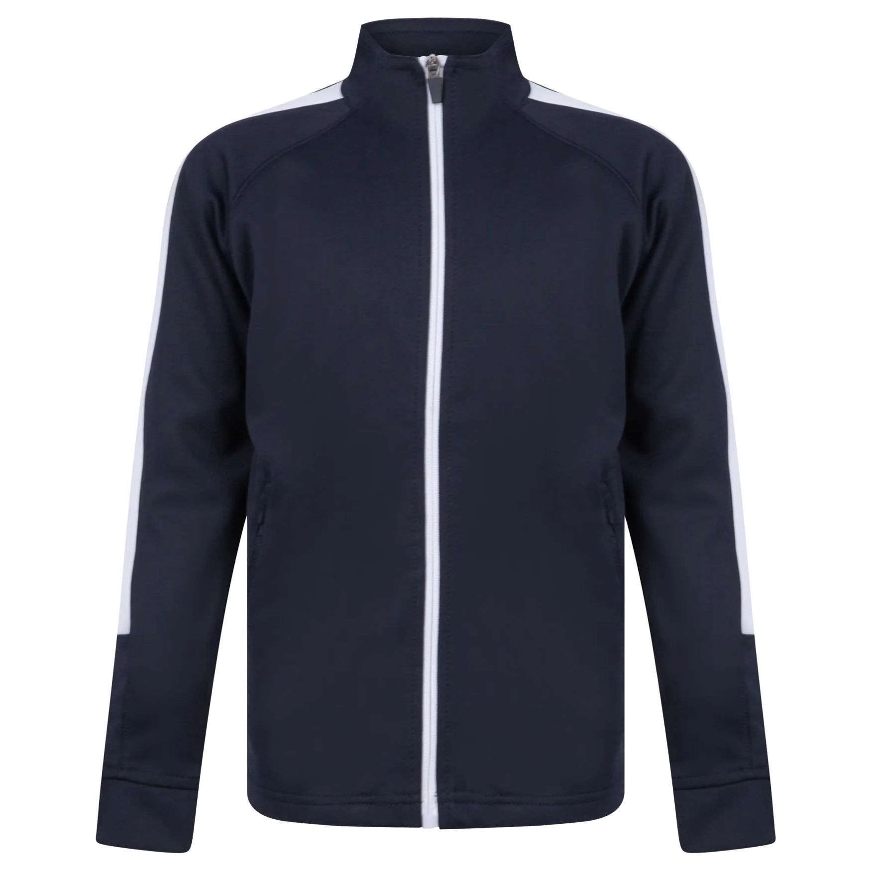 Dzianinowa bluza dresowa to dziecięca kurtka sportowa z kontrastowym zamkiem błyskawicznym, kontrastowymi pasami na ramionach i rękawach, bocznymi kieszeniami na zamek, kołnierzem typu stójka i ścigaczowymi mankietami.