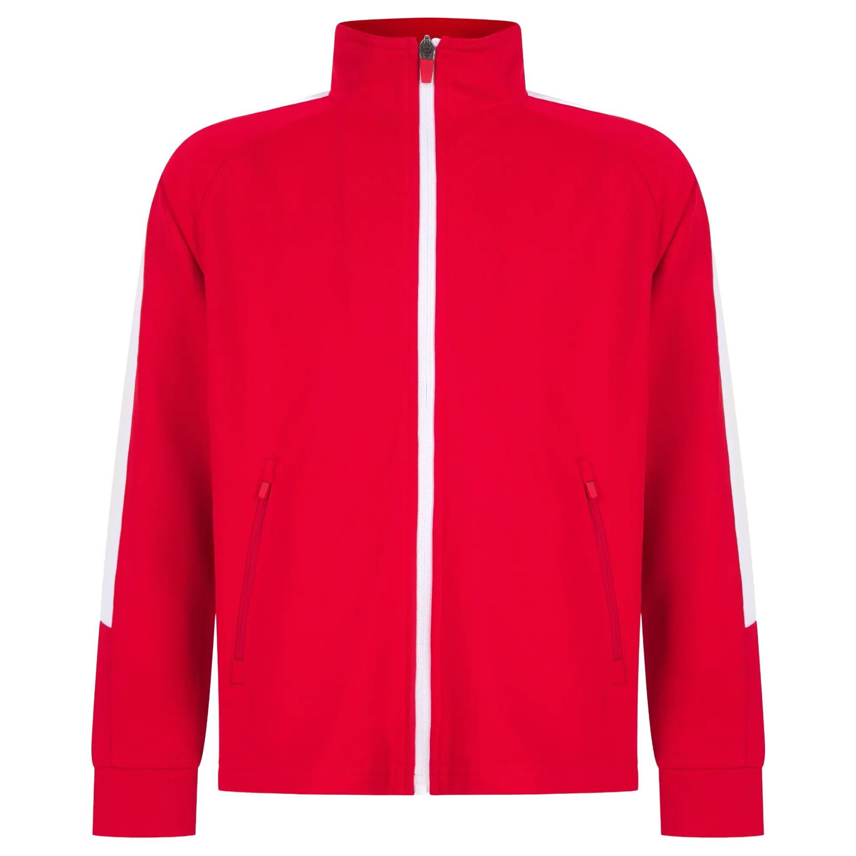 Dzianinowa bluza dresowa to dziecięca kurtka sportowa z kontrastowym zamkiem błyskawicznym, kontrastowymi pasami na ramionach i rękawach, bocznymi kieszeniami na zamek, kołnierzem typu stójka i ścigaczowymi mankietami.