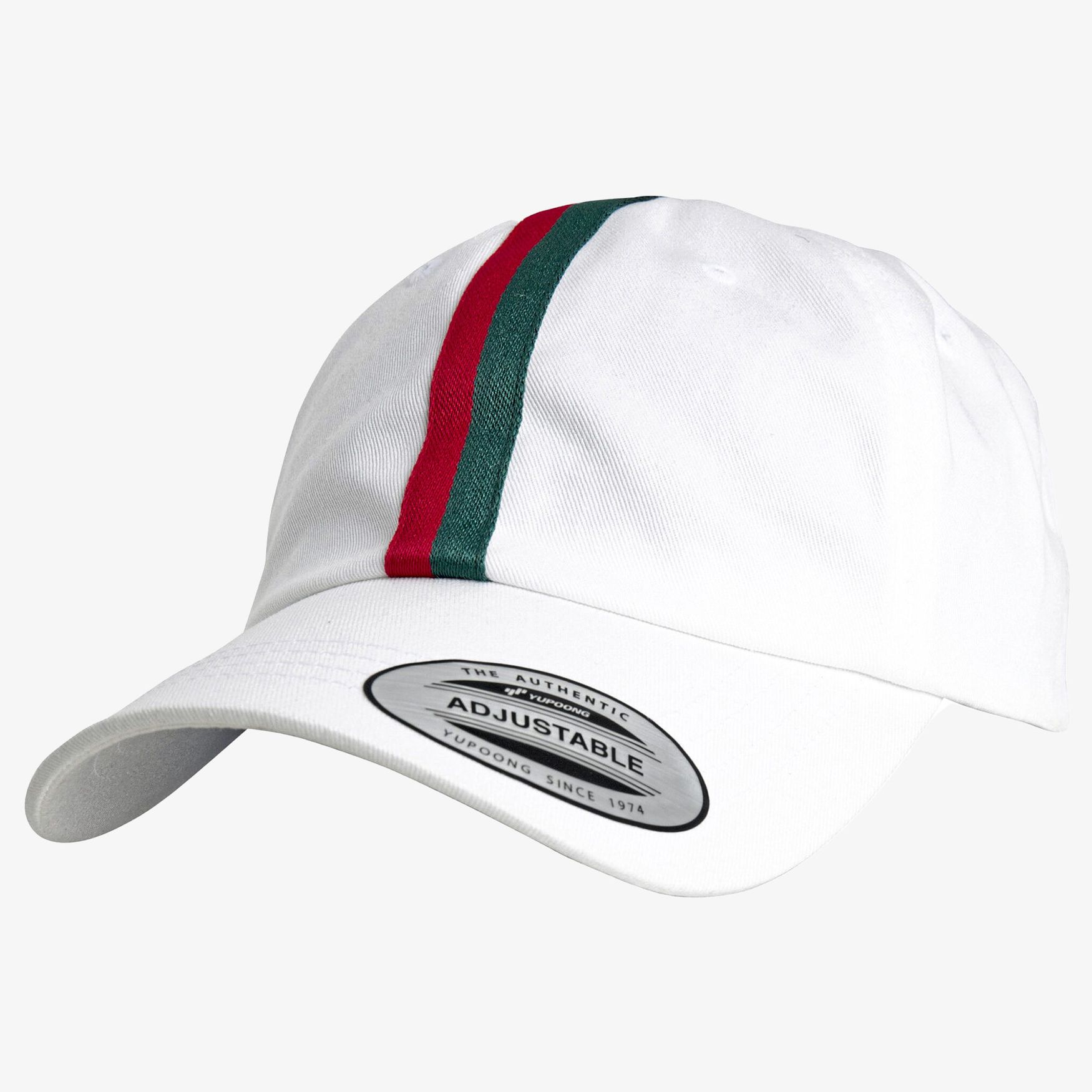 The Stripe Dad Hat is made of 100% cotton, a durable and resistant material. It features a pre-curved visor and metal buckle to adjust the head size. Its gray inner fabric and bright red green stripes at the center distinguish its appearance. This cap consists of 6 panels.