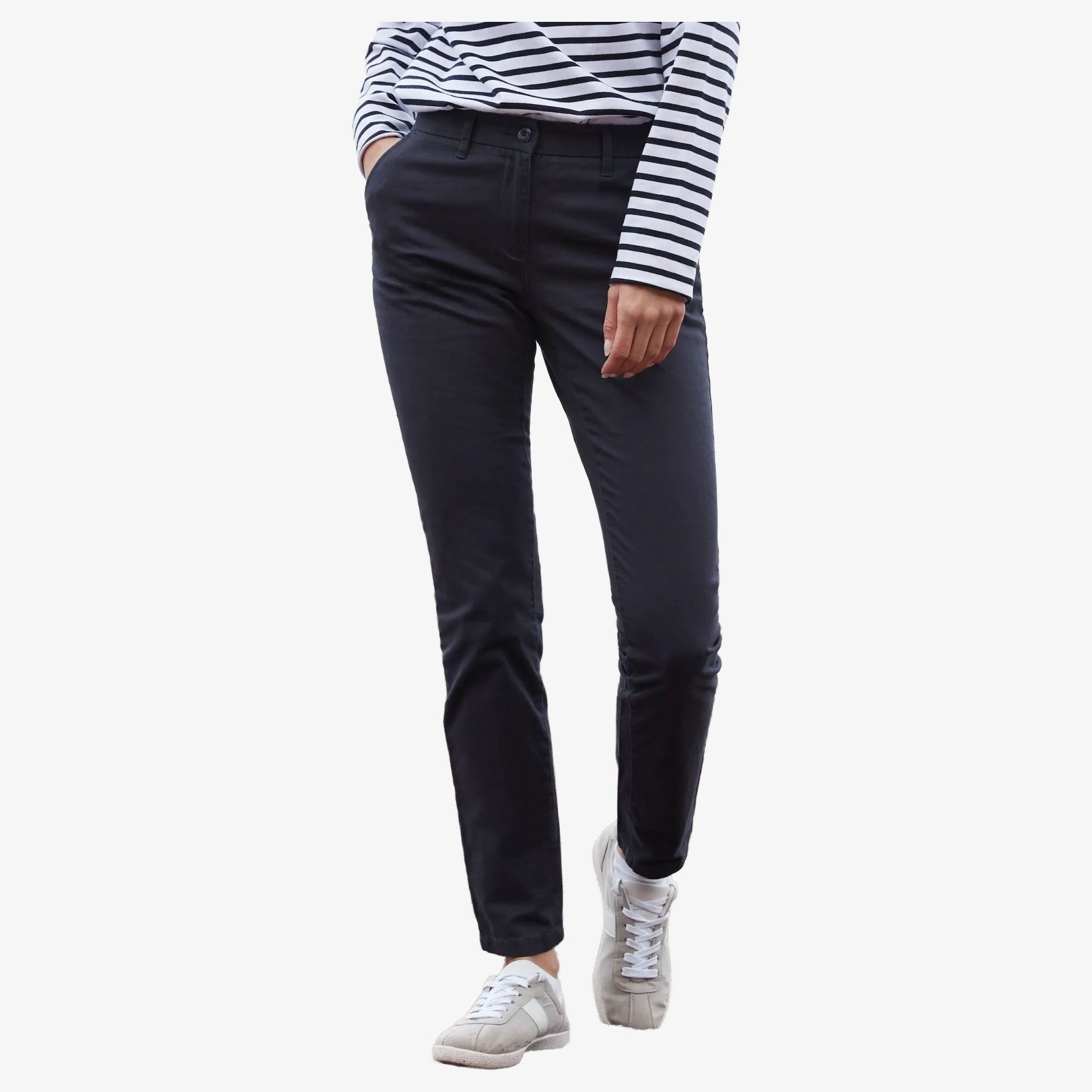 Ladie s Lightweight Chino to damskie elastyczne spodnie bez zakładek, z 2 tylnymi kieszeniami z wypustką, szlufkami na pasek, zamkiem błyskawicznym YKK i pasem zapinanym na guzik. Bez metki marki.