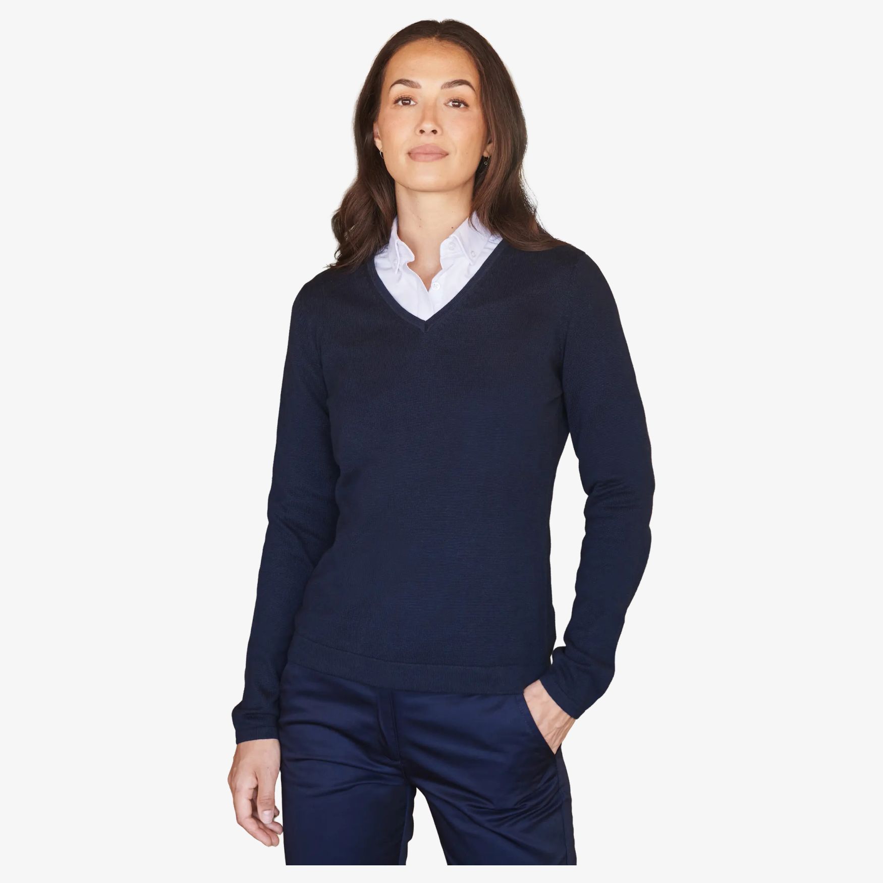 Ladies 12gg v neck Jumper to damski sweter z dekoltem V z dzianiny o uigleniu 12, z prążkowanymi wykończeniami i szerokimi, podwiniętymi mankietami. Skład: 50 % bawełna, 50 % akryl.