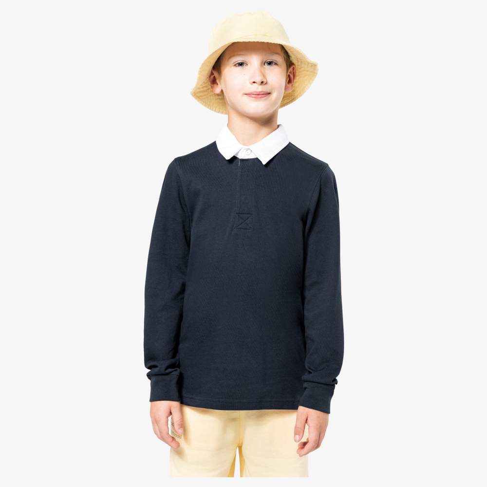 Ta koszule rugby dziecięca jest wykonana z bawełny serżanty dla optymalnego komfortu. Ma kontrastowy kołnierz bawełniany, z wyjątkiem czerwonego koloru, który posiada czarny kołnierz. Patka guzikowa zawiera trzy guziki, a mankiety są w kostkę 1x1 dla wygodnego dopasowania. Wewnętrzna wstążka czystości z rombami na kołnierzu i boczne szelki uzupełniają tę koszulę.